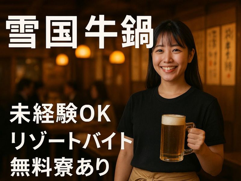 仕事内容 ╭━━━━━━━━━━━╮ リゾート居酒屋バイト! ╰━v━━━━━━━━━╯ ⭐牛鍋をメインに地の食材などを使った 人気の創作料理居酒屋です ⭐25席ほどの落ち着いたお店です ⭐時給はエリアトップクラス! ⭐海外のお客様からも人気! (英語など語学力は不問です) ⭐「一度はリゾートバイトしたかった」 というあなた、大歓迎です! ☆越後湯沢駅からすぐ近くの個室リゾートマンション完備! 温泉大浴場付きです。 部屋は1ルームより少し広い間取りなので、 カップルさんやご友人同居の応募も歓迎です。 ╭━━━━━━━━━━━━╮ フードバイト未経験OK! ╰━v━━━━━━━━━━╯ ⭐経験不問! 飲食店のホールのイメージがあれば 充分ですよ♪ ⭐ドリンク作りもすぐ覚えられます しっかり教えるので安心してネ◎ ╭━━━━━━━━━━━━╮ お仕事はこんな感じで~す ╰━v━━━━━━━━━━╯ ⭐席へのご案内、ドリンク・料理の提供、 テーブル片付け、お会計など ⭐野菜など食材のカットや仕込みも お願いします ⭐料理に興味があればどんどん教えますよ