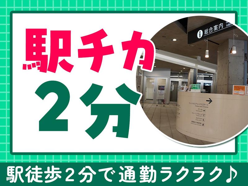 【保険制度】 雇用保険、労災保険、健康保険、厚生年金 待遇・福利厚生 【福利厚生】 *社会保険完備 *交通費規定内支給(上限880円迄/日) *昇給あり *従業員割引あり *家族割引制度あり(月会費50%オフ) *ユニフォーム貸与 *資格取得支援制度あり *正社員・契約社員登用制度あり *施設利用無料