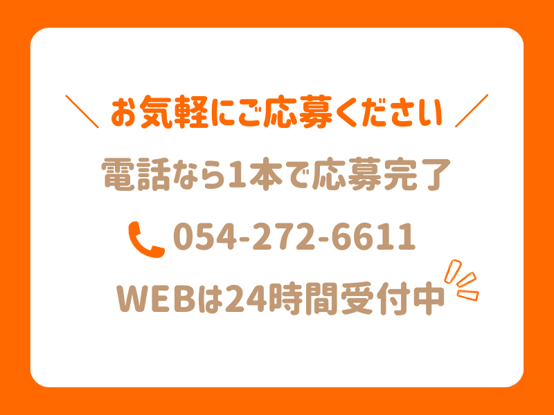 選考プロセス WEBまたは電話にてご応募ください。 WEBの場合は応募内容確認後に こちらからご連絡いたします。 電話の場合は「求人情報を見ました」と お伝えください。質問のみもOKです。 ※受付:平日9時~16時迄 【選考の流れ】 1.応募 2.面接 3.入社 *現在、他のお仕事をしている方も ぜひご応募ください。面接日や 入社時期はご相談に応じます。