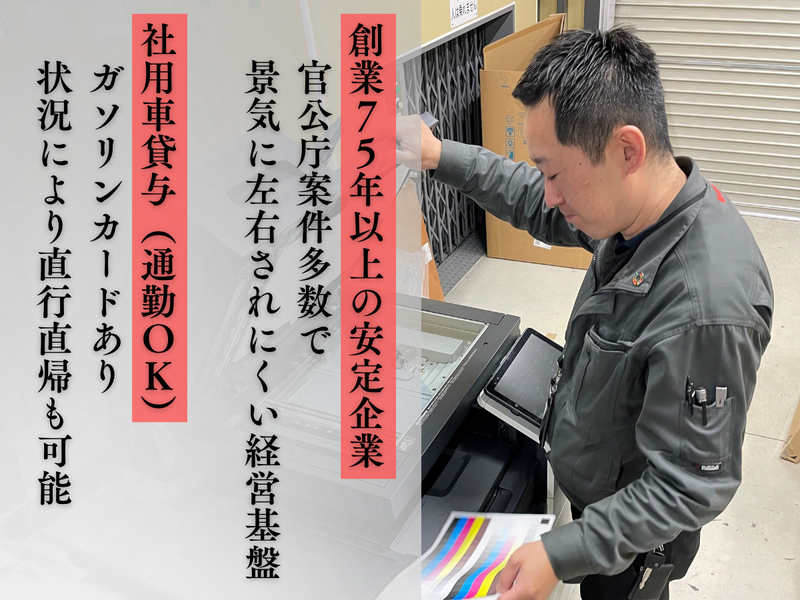 仕事内容 / 20代~30代の若手が活躍できる職場環境! 「困った時に頼られる存在」“サポートポジション”です! \ ▼ ひとつでも当てはまれば向いているかも! - □ コツコツ作業するのが好き □ 手に職をつけて安定的に働きたい □ 顧客と長く関係を築きたい - ✅ 創業75年以上の安定企業 ―― 官公庁案件多数!法人取引中心で景気に左右されにくい経営基盤。 ✅ 社用車貸与(通勤OK) ―― ガソリンカードあり/状況により直行直帰も可! ✅ 未経験から育てる体制 ―― 先輩同行+メーカー研修+OJTで習得できる! ✅ 行動範囲が現実的 ―― 県内9割以上/基本片道30分圏内(例外で1時間程度) - 官公庁・大学・地元企業など既存のお客様先へ訪問し、 1日4〜6件・片道30分圏内を中心に対応するメンテナンス業務です。 「オフィスの仕事を止めない」ための、 地域のインフラを支える技術職です。 【具体的には】※訪問先は和歌山県内が中心(9割以上) ■定期点検(動作確認、消耗品交換 等) ■不具合時の修理対応(部品交換が中心) ■機器の設置・入替、簡単な設定 ■操作説明・フォロー ■報告書作成(簡単な入力程度) ※近年は“細かい現地修理”より 部品を交換して対応するケースが中心で、 高度な専門作業が必要な場面は多くありません。 そのため、未経験からでも比較的スタートしやすい業務内容です。 【1日の流れ(例)】 8:30 出社・予定確認 9:30 顧客訪問(点検・修理) 12:00 昼休憩 13:00 顧客訪問(設置・入替・対応) 16:30 帰社・報告書作成 / 翌日準備 17:30 退社 ※訪問は無理のないスケジュールで組まれており、 移動時間も短めのエリア中心です。 入社後は先輩と一緒に現場を回るところからスタート! メーカー研修や社内OJTがあるため、 未経験の方も安心して技術を習得できます!
