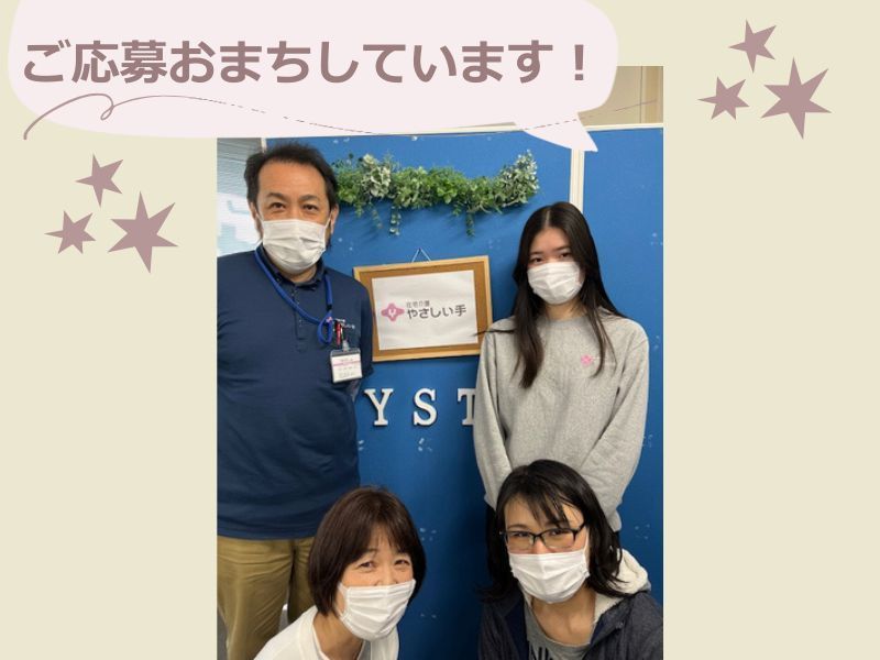 応募方法 ここまでお読みいただきまして、ありがとうございます。 ご応募は、『応募ボタン』にてお願いいたします。 <応募ボタン> 受付時間…24時間受付中!! ※ご応募内容を確認後、折り返しご連絡をさしあげます。 <採用選考スケジュール> ①応募 ②WEBでお仕事説明(面談)※対面相談可 ③仮登録完了(内定)※仮登録完了まで3日程度 ④1時間程度の動画視聴いただき、本登録完了 ⑤店舗からお仕事紹介します ※応募後、WEBで簡単登録(履歴書添付)をお願いいたします。 履歴書提出方法はご相談可能です。 ※ハローワークでお仕事をお探しの方も対象です。 ※入社日も応相談ですので、まずはご相談ください。 【会社概要】 会社名:株式会社やさしい手 事業内容:介護事業・コンサルティング事業 年商:約210億円 社員数: 6,018人(常勤1,459人非常勤4,559人) ご高齢の皆様がご自宅で暮らす上での不安やお困りごと、その一つひとつを安心にかえるために、皆様の立場になって生活のご支援をしてまいります。「住み慣れた家で、最期まで生きる」その想いを、私たちが実現します。 担当 採用担当