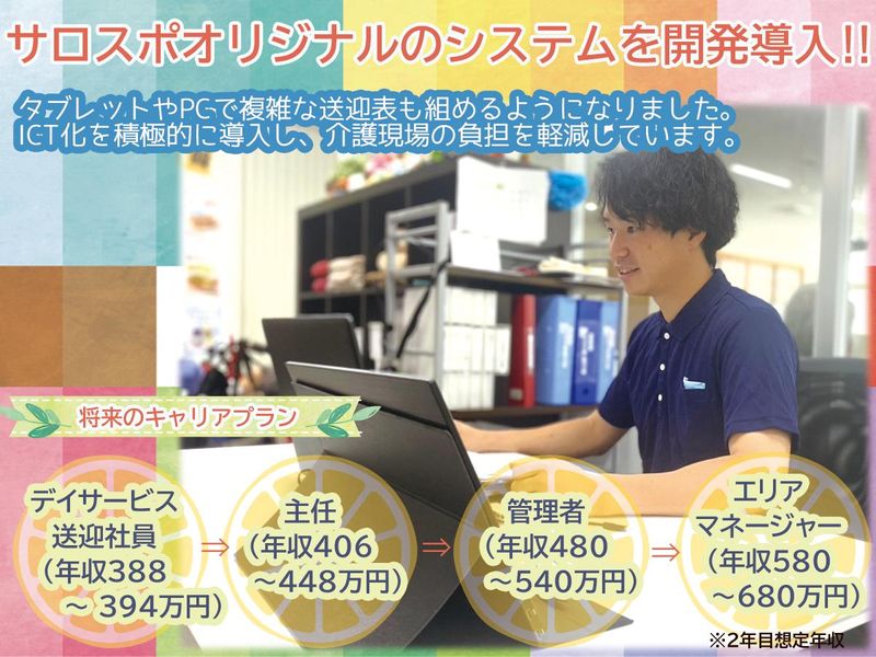 仕事内容 ✨スタッフ大増員✨ 2025年7月のOPEN以来大盛況!! 満員上昇の見込みがあるための増員 デイサービスの介護スタッフ(送迎あり) ――――――――――――――― ⭐今だけ入社祝いキャンペーン⭐ 2026年5月までに入社された方に限り 「入社祝い金10万円」支給!! ※規定あり ――――――――――――――― <ここがポイント> ⭐資格がなくても、送迎できる方は月30.4万円~スタート ⭐更に介護福祉士は月31.9万円~スタート ⭐子供手当1人につき月10000円あり ⭐残業は遅くても18:30まで ⭐育児や家事と仕事の両立が可能なデイ ⭐希望休は100%取得でき有給消化率は100%推奨! 【新しいカタチのデイサービス】 salon&sports(サロスポ)ではじめよう!! ハイブリッド型デイサービス≪salon & sports(サロスポ)≫とは、充実したレクリエーションや毎日イベントができる【レスパイト型】+【理学療法士常駐の新式の運動マシンがあるリハビリ型】を融合した新しい形の1日型デイサービスです。 デイサービスは全国に約3万店舗以上ありますが、ハイブリッド型デイサービスは弊社が運営する「サロンアンドスポーツ」のみになります。 当グループは、全国の介護施設の運営コンサルタントの経験があり、ご利用者様の声から生まれた理想の形のデイサービスです。 一人ひとりの前向きな意見が反映されやすく、「働きやすい職場」を自分たちで築けることが魅力です! 【主な仕事内容】 ・朝と夕方の送迎業務(要運転免許) ・PCによる送迎表作成・更新 ・午後からのイベント(スポーツレク)などに参加!! その他、ご利用者様の管理業務に係る担当業務 ご利用者様は「要支援~要介護2」の軽度な方ばかりで重度な身体介護やおむつ交換はありません! イベントの買い出しや事前準備等もお願いしますね。 【子育て世代に嬉しい手当充実】 スタート給与が高いため、20代・30代の若手社員も安定して家庭+仕事の両立ができています。 また、お子さん1人につき月10.000円の子供手当あり!(世帯主に限る) 【丁寧な研修制度】 まずは座学やデイサービスの理解などの「スタートアップ研修」からスタート! その後も、マンツーマンで先輩が付き添ってくれるので安心! 研修生として「ゆとりある人員体制」で現場に入ることができます。 ≪会社負担で受講できる研修・勉強会多数あり≫ ◆介護福祉士実務者研修 ◆介護福祉士試験勉強会(4年連続合格率100%!) ◆介護以外の外部講師キャリア研修も充実⭐︎ (マネジメントやリーダー、SNS、イラストレーター、マナー研修など50以上の研修を用意しています) 未経験者の定着率は90%以上、未経験入社からの介護福祉士の合格率は3年連続100%と、初めての方も安心してスタートできる環境を整えています! <1日のスケジュール> ◎8:00~送迎(お迎え) ※送迎車両はトヨタのノアor軽自動などの一般車になります。 ◎11:30~食事配膳/下膳 ~休憩~ ◎13:00~レクリエーションや毎日のイベント実施 (手工芸やスポーツレクなどが充実のデイサービスです) ◎14:00~送迎表作成(PC操作あり) ◎15:00~送迎(お送り)※送迎車両はトヨタのノアor軽自動など ◎17:30~夕礼 ◎17:50~18:30 退社 ※送迎業務がない日もあります。その場合は送迎業務なしの業務同様になります。 <1日の業務割合> 送迎業務:介護(イベント実施含む)業務:管理業務=6:2:2 送迎業務が大半を占める仕事ですので、車の運転が好きな方大歓迎です! ======================== ✨わたしらしいデイサービスを 知るお茶会開催中✨ 現役スタッフとざっくばらんに話せる 座談会スタイルで、リアルな声を聞き、 職場見学ができます! 参加無料・服装自由・履歴書不要! おいしいお菓子&お茶をご用意 ちょっと話を聞くだけでも大歓迎! お友達と一緒の参加もOKです! [詳しい内容&日程はコチラ] ↓↓↓ https://salosupo-saiyo.com/tea-party/ ========================
