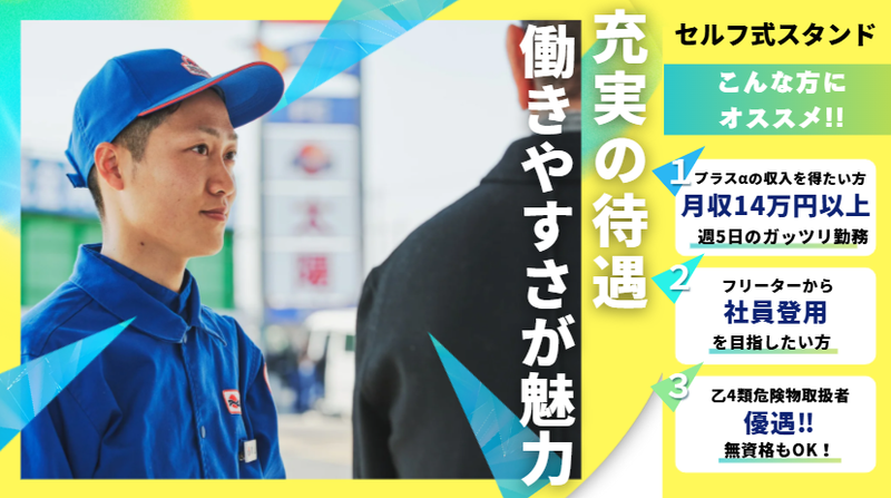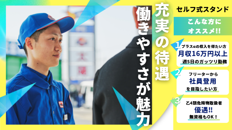 求めている人材 \未経験・無資格OK!学歴不問&ブランク歓迎/ ガソリンスタンドや車に関する 知識がなくても大丈夫! 実際に「やってみたい」で始めた 未経験の先輩も多数活躍中! 人柄・やる気を重視した採用なので、 まずはお気軽にご応募下さい♪ ✅【こんな方にオススメ】 ・学業と両立しながらお小遣い稼ぎがしたい方 ・フルタイムで安定収入を得たい方 ・シフトにたくさん入りたい方 ・接客よりコツコツ作業が好きな方 ・ルーティンワークが得意な方 ・フリーターから社員登用を目指したい方 ✅【活かせる経験・スキル】 ・セルフガソリンスタンドの勤務経験 ・車検・整備士工場などでの実務経験 ・メカニック、自動車整備士、自動車検査員などの資格・スキル ・カーディーラーでの接客や軽整備経験 ✅【優遇資格】 ◇乙種第4類危険物取扱者 ※資格がなくてもご応募OK!資格取得支援制度あり◎ ✅【活躍中のスタッフ】 男女問わず幅広い年代のスタッフが活躍中! 大学生・フリーターさんも多数在籍しています!