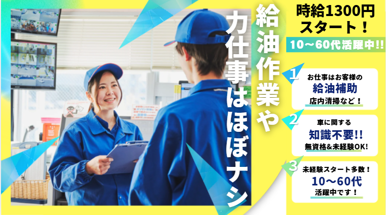 仕事内容 \未経験大歓迎!短時間で高収入GET!/ セルフガソスタで【接客少な目&力仕事ナシ】◎ ✨1日4時間~OK&着替え時間も手当支給✨ ✨♦°˖⭐°˖✨♦°˖⭐°˖✧✨♦°˖⭐°˖✧ 【ここがポイント!】 ◆未経験でも時給1300円スタート! ◆平日は夕方~!学業との両立も出来る! ◆土日祝は7:00~24:00で時間帯は自由に選択可能! ◆さらに… ⇒着替え時間にも手当支給あり◎ ✨♦°˖⭐°˖✨♦°˖⭐°˖✧✨♦°˖⭐°˖✧ ー【お仕事内容】ー ◆セルフ式のガソリンスタンドでの接客サポート業務 *給油補助 *店内清掃・整備 *お客様対応(少なめ) →給油作業や力仕事はほぼナシ! 未経験でも安心して始められる内容です◎ 車に関する知識も必要ナシ! ー【働き方】ー ⏰平日のシフト例 ・17:00~22:00 ・18:00~22:00 ・18:00~24:00 ・7:00~16:00 ・8:00~17:00 ⏰土日祝のシフト例 ・7:00~16:00 ・8:00~17:00 ・13:00~22:00 ・15:00~24:00 など 「学校終わりに働けるバイト先を探している」 「安定収入が欲しい」 「フリーターから正社員を目指したい」 そんな方にぴったりの環境です! ー【未経験スタートを全力応援!】ー 初めてでも安心して始められる理由があります! 「ガソリンスタンドって、難しそう…」 「資格がないとできないのかな…」 そんな心配、ここでは一切いりません! ◆セルフ式スタンドだから… ・お客様が自分で給油する仕組み! ・スタッフは”サポート役”がメイン ・力仕事・専門知識も不要です◎ ◆未経験スタートの先輩が多数! 今活躍中のスタッフも、ほとんどが未経験からのスタート。 最初は先輩がマンツーマンで丁寧に教えるので、 「ガソスタデビュー」も安心です♪ ◆無資格OK!もちろん資格取得もサポート! 「乙4類危険物取扱者」など、 働きながら資格を取得する事も可能! 取得支援制度もあるので、 将来のためにスキルを身に付けたい方にもおすすめです!