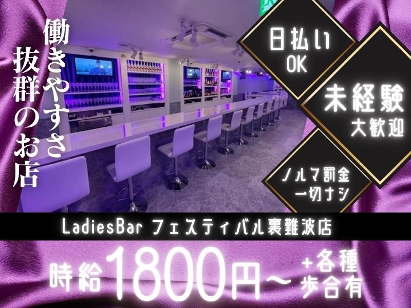 仕事内容 【Ladies Bar フェスティバルのポイント♪】 ◎各種インセンで月収30万円以上は余裕♪ ◎ガッツリ稼ぎたい&好きな時間に♪ ◎各種ノルマ・無理な飲酒は一切なし! ◎駅チカ系列店多数♪お店の選択可能! アミューズメントバー 『Ladies Bar フェスティバル難波店』にて カウンタースタッフを募集します♪ - 【具体的なお仕事内容】 ◆カンタンなドリンクづくり ◆お客様と楽しくおしゃべり♪ ◆ダーツの準備 ◆カラオケのセッティング! など ドリンクづくりは、 「グラスに注ぐだけ」 「お水や炭酸で割るだけ」でカンタン♪ お客様と一緒にワイワイ♪できたらOKです! 【入店したら】 まずは、マネージャーや頼れる先輩が マンツーマンでお仕事をお教えします! ドリンクのつくり方から おしぼりやチャームの準備など、 基礎からひとつひとつ指導していきます。 接客経験や夜職経験がない方でも 不安なく働けるように、 業務中は常に複数のスタッフで見守ります。 いつでも助けてもらえる環境なので、 遠慮なく甘えてくださいね~! 【接客スタイルについて】 カウンター越しの接客なので、 お触りや隣につくことはございません! お酒を飲みながら(飲めない子はソフドリで♪) お客様と楽しくお話するだけでOK! カラオケはワイワイ盛り上げられたら完璧です! 連絡先交換はお店は推奨していません。 - 【一緒に働くスタッフについて】 ■大学終わりにガッツリ稼ぐ大学生さん ■昼職と両立して働く会社員さん ■ガッツリ稼ぎたいフリーターさん 20代~30代の女性スタッフが活躍しています♪ 全体の9割が夜職未経験からスタート! 優しくて盛り上げ上手な方が多いですよ♪ 【20代スタッフインタビュー】 昼職の収入が低いため、生活費を まかないたくて当店に応募しました。 お酒がそこまで得意ではないので、 無理な飲酒がないところが助かっています。 各種ノルマもなく、連絡先交換も断れるので、 精神的な負担もなく伸び伸び働けています! シフト融通もかなり利くので、 稼ぎたい目標金額通りに稼げることが多いです。 各種バックやインセンも多いので、 未経験でも効率的に稼げるお店ですよ♪ - 【毎日ストーリー更新中♪】 インスタ:@nanbafes