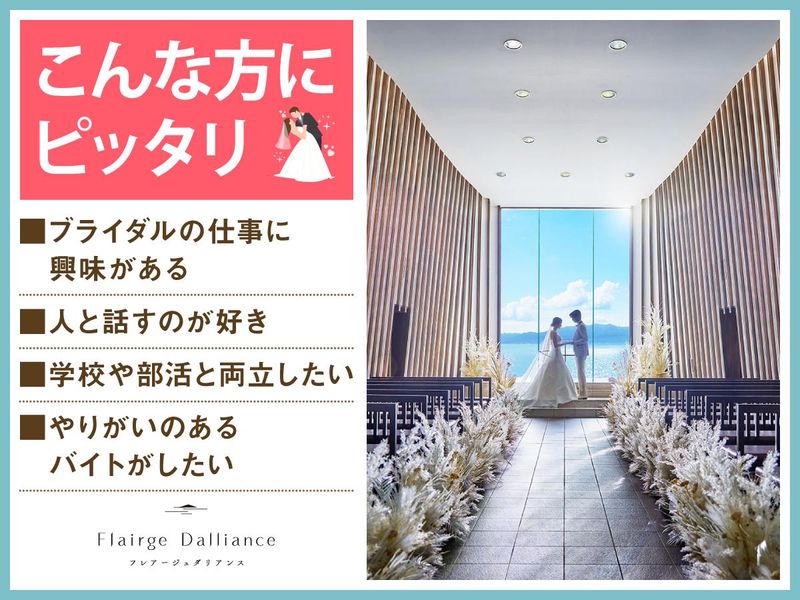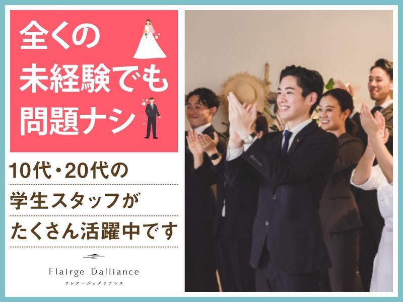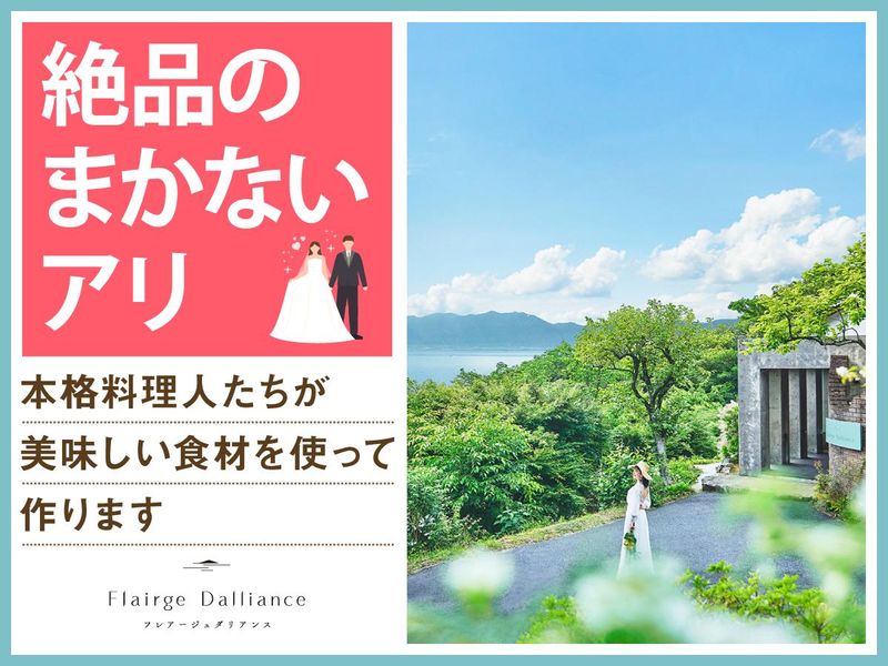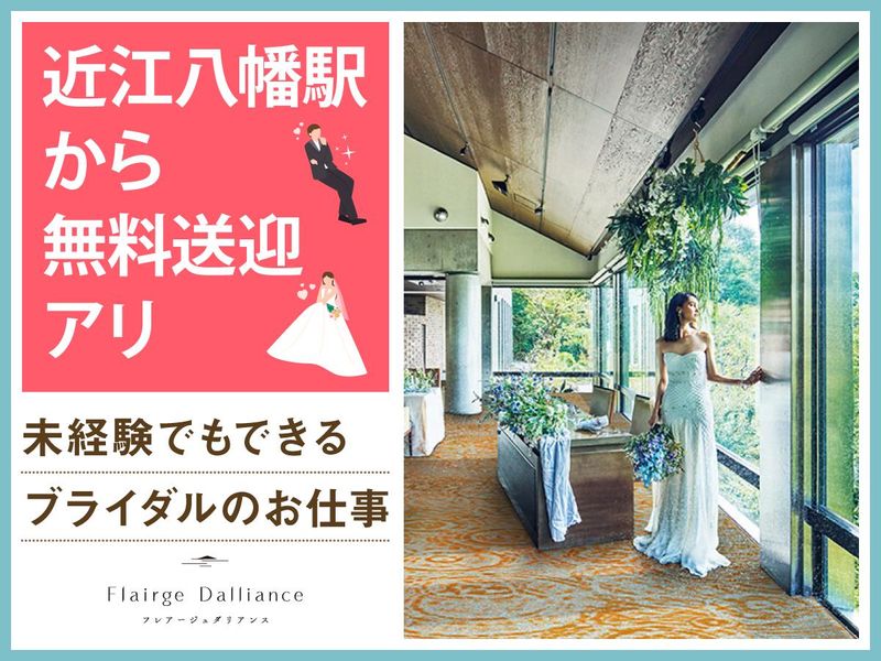 仕事内容 *琵琶湖のほとり森の中に佇む結婚式場* 感動いっぱいの結婚式を一緒にサポート♪ 授業やサークルのない日に勤務OK★ WワークOKで高校生・大学生が活躍中! 「人が喜ぶ姿が好き」「サプライズが好き」 という方必見!スキルや経験は一切不要♪ 一緒に素敵な結婚式を演出しましょう* フレアージュ ダリアンスは 琵琶湖を望む絶景と緑に 囲まれた一軒家の結婚式場。 ウェディングのお手伝いをするお仕事です◎ <主なお仕事内容は…> 結婚式場スタッフとして 次のお仕事をお任せ! ■会場の準備 ■お客様の上着や荷物のお預かり ■お席のご案内 ■結婚式のお料理・ドリンク提供 ※キッチン業務はありません◎ ―――――――――――――――― 高校生・大学生が活躍中! オススメポイントはこちら★★ ―――――――――――――――― ・授業やサークルとの両立応援! ・週1日~1日4時間~OKで融通◎ ・近江八幡駅から無料送迎アリ♪ ・絶品のまかないアリ(^^) ・同世代が多くて安心◎ まかないは本格料理人たちが美味しい食材を使って作ってくれます♪♪ 現在は高校生2人、大学生5人が在籍中! お友達同士の応募も大歓迎! ―――――――――――――――― 特別な1日をサポートするお仕事 具体的な仕事の流れは? ―――――――――――――――― ▶STEP.1 ミーティング 披露宴の流れやお料理について スタッフ間で事前に確認して 式中にバタバタしないようにします◎ ▶▶STEP.2 披露宴会場の準備 お席に置く名札や ゲストの方に渡す引き出物を確認したり グラスを磨いたりして準備します。 ▶▶▶STEP.3 お客さまのお出迎え 荷物をお預かりし、 待合室でドリンクをお出しします! ▶▶▶▶STEP.4 ホール業務 お席にご案内し、順番にお料理や ドリンクを提供します◎ ―――――――――――――――― 未経験者歓迎! みんなで助け合う雰囲気です ―――――――――――――――― 最初は結婚式の見学からスタート! 見学後は本番じゃないところで、 同世代を集めて研修を実施。 飲食業やホールスタッフが 初めての子には、 お盆の持ち方から教えます!