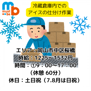 インフォメーション 【2月~9月の期間限定】大手スーパーの冷凍倉庫ワーク。未経験歓迎のシンプル仕分け。日払い・週払いOKで即収入! 【ビデオ通話での簡単登録始めました】 「must be (マストビー)だからこそ」 お仕事のご紹介特典いろいろ ・子育て主婦(夫)さんや自営業や シフトワーク、 Wワーク希望の方にもマッチした 勤務形態をご紹介。 ・フルタイム、パートタイム、時短勤務など のいろんな働き方の方々を応援! ・日払い、週払いOK!急な出費にも安心の お給与体制があります。(規定あり) ・来社は不要!出張登録OK! あなたのお住まいのお近くのカフェや 喫茶店で登録手続きができます♪ ・学歴不問、あなたのやる気を応援、 お仕事紹介でサポートいたします! ・学生さん、主婦(夫)さんから、 バリバリ稼ぎたい方、 まだまだ働き盛りの50代の方まで、 幅広い年齢層の方々が絶賛活躍中! アピールポイント ビデオ通話での簡単登録可能 must be(マストビー)では多種多様な職種を 取り揃えています。 どんな仕事を探しているかお気軽に お問合せ下さい! 3月は採用強化中! 3月中に応募いただいて 「3月中のスピード入社」はもちろん, 4月以降入社も随時相談承ります!