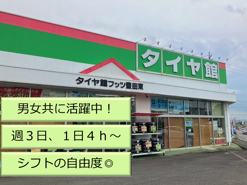 仕事内容 ✅未経験者歓迎!男女共に活躍中 ✅時給1300円~ 11月・12月の土日は時給1400円 ✅週3日、1日4時間~OK シフトの時間帯の自由度も◎ 【仕事の詳細】 ♦入社いただいたら… まずは掃除、片付けなどから始めてもらい、工具の名前を覚えていったり、徐々に職場に慣れていただきます! 未経験の方でも大丈夫!丁寧に業務を教えますので安心して働いていただけますよ♪ 接客は一切ありませんので黙々と作業することが好きな方にはうってつけのお仕事です! ♦職場に慣れてきたら… タイヤを袋から出したり、タイヤの空気圧のチェックなど、タイヤ交換の補助をお願いします! リフトを使って車を動かす作業もありますが難しい作業はありません。 【ムリなく働けます】 常に屋外作業ではなく、タイヤの交換作業は1日の業務の中で2~3時間程。 それ以外は店内で掃除をしたりして、おちついて過ごせます。 幅広い世代のメンバーが活躍中です! 学生さん、主婦さん、フリーターの方など、それぞれのライフスタイルに合わせて働いています。 【シフトのパターンはいろいろ】 週3日~、1日4時間~OKです! 10時~18時の間で、あなたの生活スタイルに合わせて働けます。 ・「子どもが学校に行っている間に」という方は 10時~15時の勤務 ・「大学の授業が午前で終わる日に入りたい」という方は 14時~18時の勤務 ・「扶養内勤務にとどめたい」というのもOKです! まずはご希望を聞かせてくださいね!