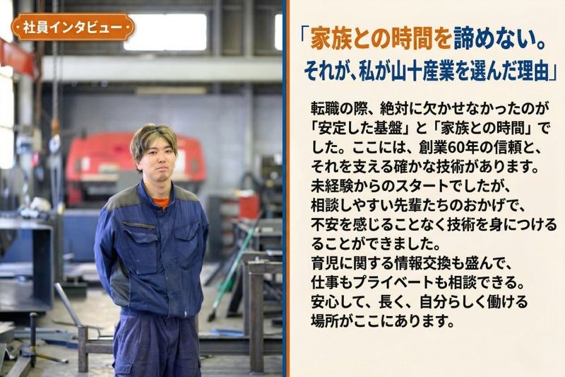 【仕事内容】 \溶接経験、次は“安定と将来”に活かしませんか?/ 鉄製品の加工・溶接経験者を正社員募集! 《経験者の条件》 ・半自動溶接/アーク溶接/TIG溶接 ・鉄製品の組立(穴あけ/切断/溶断) ・金属塗装、部品加工経験 ※経験年数は問いません/ブランクOK ※どれか一つでも当てはまればOK! ――――――――――――――――――――― 【加工・溶接スタッフの働きやすいポイント】 ――――――――――――――――――――― ✅年間休日121日(リフレッシュ旅行補助金あり) ✅賞与年2回(昨年度実績2~3ヶ月、最大4ヶ月) ✅残業代は1分単位で全額支給 ✅福利厚生充実(家族手当・各種祝い金・退職金制度等) ――――――――――――――――――――― 【仕事内容】 自社工場内で、中板中心の鉄製品の溶接・組立・仕上げをお任せします 扱うのはミキサー車・ダンプカー・クレーン車などの大型車両部品です ▼具体的には 中板(3〜9mm)の半自動溶接 アーク溶接・TIG溶接(小物部品で使用) 部材の穴あけ・切断(ガス溶断・プラズマ) 専用治具を使った組立作業 塗装前の下地処理、仕上げ 案件に応じて扱うパーツが変わるため、 飽きることなく、技術の幅を広げられます◎ 大型車両の溶接は、 高い精度と経験が求められます 手作業だからこそ価値がある技術です! 【こんな方に向いています】 ・中板〜厚板の溶接経験を活かしたい ・大物フレームの溶接技術を磨きたい ・家庭と両立できる働き方をしたい ・福利厚生の整った安定企業で働きたい ・資格を取得してさらにステップアップしたい 【給与例】 経験3年:月給28万~32万 経験5年:月給32万~35万 経験7年:月給35万~39万 ▶ご経験や、家族構成、お持ちの資格により変動有 【株式会社山十産業について】 創業60年以上の実績を持ち、鉄製品の製造を行っています 産業機械などの設備を設計から製作、メンテナンスまで一貫して提供 お客様に高品質でスピーディなサービスをお届けしています 【職場環境】 健康経営優良法人として“健康第一”の職場づくりを推進し 《やまなしワーキングスタイルアワード受賞》《子育て応援企業》にも認定 社員が安心して働ける仕組みを大切にしています 20代~40代中心の落ち着いた職場で働きやすい環境です ★Instagramも随時更新中♪《@yamajyuu_coltd》 「これまで培った経験を活かし、安定収入と家族を守れる環境を手にしたい」 そんな方のご応募をお待ちしています!
