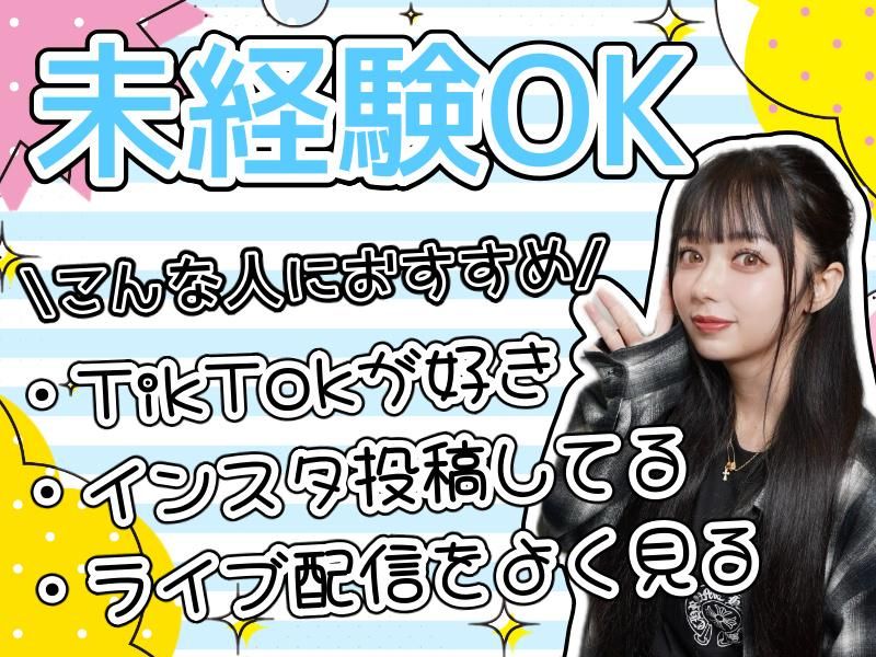 求めている人材 ■必須条件 ・販売職の経験がある方 ※アパレル店員やショップ店員など 業界は問いません! ■こんな方は大歓迎 ・話すことが好きな方 ・TikTokライブを見たことがある方 ・SNSやWebメディアに触れるのが好きな方 ・SNS運用や広告運用の実務経験がある方 < 未経験でOK > ライブ配信の経験はなくても大丈夫! チームで運営しているので配信中もしっかりあなたをサポートします♪ ライバー・インフルエンサーへの憧れがある方にとってもおすすめ◎ あなたも有名インフルエンサーみたいに活躍できるかも!? 少しでも興味があれば ぜひご応募してくださいね!