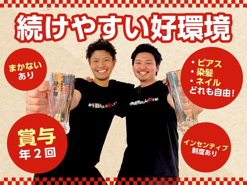仕事内容 「ずっと今のままでいいのかな」 …そんな不安、ここで終わりにしませんか? 「正社員になりたいけど、 自由がなくなるのはイヤ」 「フリーターの自分って ちゃんと評価してもらえるのかな」 こんな風に思ったことはないですか? “これまで通り”のあなたのままで、 働き方は大きく変わらずに。 そして、これまで頑張ってきた 時間も経験も、 決してムダにしないように。 全国に『酔っ手羽』を展開するS.H.N株式会社は、 今までやってきたことを評価して、 あなたを「正社員」として迎えます!  ̄ ̄ ̄ ̄ ̄ ̄ ̄ ̄ ̄ ̄ ̄ ̄ ̄ ̄ ̄ ̄ ̄ ̄ ̄ ✅「正社員=休めない」はもう古い! 「自由な働き方」は、正社員でも同じ。 当社なら、月6〜10日の間で、 【自分で】休日数を選択可能です! 6日休みでガッツリ稼ぐ人もいれば、 10日休んで趣味優先の人もいます。 もちろん有給取得だって当たり前。 連休もOKです。 “ちゃんと休める”からこそ、 仕事にも100%の力で向き合えます! ✅「頑張り」は給与に反映 ・忙しくても手を抜かない ・周りを見て動く ・新人に声をかける ・ドリンクもホールも どっちも回す こういうこと、 今まで普通にやってきていませんか? こんな“当たり前”のことも 当社では評価の対象! もちろん評価は、 年3回ある【昇給チャンス】で 給与にしっかり反映。 ちゃんと変わっていく実感があります。 実際に未経験で入社した後、 コツコツ続けて給与アップした人も! 数字だけじゃなく、 “普段の動き”も見ている会社です。  ̄ ̄ ̄ ̄ ̄ ̄ ̄ ̄ ̄ ̄ ̄ ̄ ̄ ̄ ̄ ̄ ̄ ̄ ̄ ■仕事内容 ✅お客様のご案内 ✅オーダー対応 ✅料理・ドリンクの提供 ✅簡単な調理・盛り付け ✅片付け・清掃 など まずはお客様のご案内やオーダー対応など、 できることからお任せします。 「包丁を握ったことがない」 「接客は初めて挑戦する」 なんて先輩たちも、 今では店舗を支える中心メンバー。 一歩ずつ成長していきましょう! ■「酔っ手羽」とは? 昭和レトロな懐かしさと、 現代的な活気が絶妙に混ざり合った 独自の空間。 それが「酔っ手羽(よってば)」の 大きな特徴です。 マニュアル通りの無機質な接客ではなく 目の前のお客様を笑顔にするための 「遊び心」を大切にする社風だからこそ、 スタッフ一人ひとりの個性が お店の味になります。 そんな活気ある現場で、 あなた自身の個性を活かしながら、 お客様と一緒に最高にハッピーな空間を 作り上げていきましょう。 ■仕事も、遊びも、全力で! 忙しい時間帯は、自然と 声をかけ合いながら回しています。 困っている人がいたら フォローするのが当たり前! 一人で抱え込むことはありません。 みんなで全力で頑張ったら 年に一度の社員旅行へ! 毎年沖縄に行って 海やBBQなどを楽しんでいます。 普段は真剣に仕事をして、 遊ぶときは思い切り遊ぶ! だからこそ、 「このメンバーと、また来たい!」 「来年も行くために、頑張ろう!」 そう思える関係性が、 自然とできています。  ̄ ̄ ̄ ̄ ̄ ̄ ̄ ̄ ̄ ̄ ̄ ̄ ̄ ̄ ̄ ̄ ̄ ̄ ̄ 未経験でも、自分に自信がなくてもOK! ✅頑張りが評価されて、 給与に反映される ✅休みもしっかりある ✅チャンスが多い ✅仕事も人生も楽しめる そんな環境で、 新しいスタートを切りませんか?  ̄ ̄ ̄ ̄ ̄ ̄ ̄ ̄ ̄ ̄ ̄ ̄ ̄ ̄ ̄ ̄ ̄ ̄ ̄ <<S.H.Nで働くメリット>> ✅ピアス・染髪・ネイル自由の正社員! ✅全国600店舗展開の安定成長企業◎ ✅住宅手当・まかないなど福利厚生充実♪ ■充実の福利厚生でバックアップ♪ ✅昇給年3回 ✅賞与年2回 ✅インセンティブ制度 ✅月最大10日休み ✅引越手当(1律10万円)※規定あり ✅住宅手当(1律2万円支給)※規定あり ✅社内レクリエーション ✅独立支援制度 など ■キャリアの“詰まり”がない S.H.Nは、全国に続々と 新店を展開する成長企業! 今年の出店計画は30店舗以上です。 新しいお店ができる = 新しいポジションが生まれる = チャンスが増える! 未経験入社3年で店長になった社員も! 「年齢」や「社歴」よりも、 行動した人にチャンスが回ります。 ■実力に応じてキャリアアップ 店舗運営を一通りマスター、その後は… 実力を正当に評価して昇格・昇給に反映! ◇副店長:月給33万円~35万7000円 ◇店長候補:月給36万円~38万円 ◇店長:月給40万円~ ◇エリアマネージャー:月給45万円~50万円  ̄ ̄ ̄ ̄ ̄ ̄ ̄ ̄ ̄ ̄ ̄ ̄ ̄ ̄ ̄ ̄ ̄ ̄ ̄ ⭐いきなり正社員が不安な方は、 1週間の「お試し体験入社(時給制)」から 始めることも可能です。 まずは一度、あなたのこれからのことを お話ししませんか?