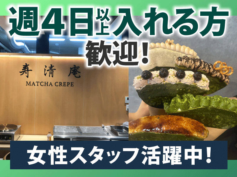 仕事内容 イートインなし◎職種未経験でも安心! SNS・TV等でも話題の抹茶クレープ店♪ #週2日~&1日5時間~#まかないあり SNS等の動画総再生回数1億回超え!! 人気の抹茶クレープ専門店で アルバイト・パートスタッフ募集✨ \\お仕事詳細//  ̄ ̄ ̄ ̄V ̄ ̄ ̄ ̄ ✅クレープ調理・ドリンク作成 ✅レジ・会計 ✅店内清掃 …などをお任せします!! まずは店内業務のオペレーションを 覚えていただきます! ひとつひとつ丁寧にお教えするので、 未経験の方やブランクがある方なども 安心して始めることができますよ◎ *~*~*~*~*~*~*~*~*~* \\テイクアウト専門店だから…//  ̄ ̄ ̄ ̄ ̄ ̄ ̄ ̄V ̄ ̄ ̄ ̄ ̄ ̄ ̄ ̄ ⭐カウンターでの接客対応や キッチンでの調理がメインです! ⭐イートインスペースはありません◎ テーブルセッティングなどもナシ♪ *~*~*~*~*~*~*~*~*~* \\オープンしたばかりの新店舗//  ̄ ̄ ̄ ̄ ̄ ̄ ̄ ̄V ̄ ̄ ̄ ̄ ̄ ̄ ̄ ̄ 人間関係もまだまだ構築真っ最中! お店の雰囲気作りもできますよ♪ 効率のいい方法を考えたり、 イチからお店の文化を築いたり… と、やりがいもバッチリです◎ 一緒にお店を盛り上げてくれる方、 お待ちしています✨ *~*~*~*~*~*~*~*~*~*