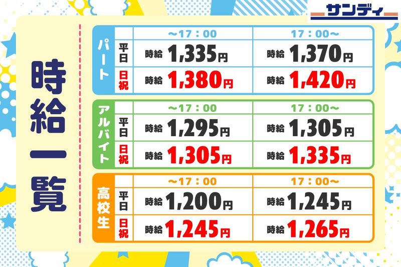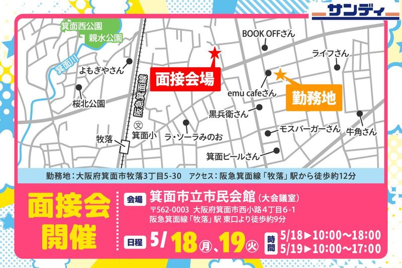 仕事内容 ☆*★*☆*★*☆*★*☆*★*☆ ディスカウントスーパー サンディ箕面牧落店 オープニングスタッフ大募集! ☆*★*☆*★*☆*★*☆*★*☆ <2026年6月初旬オープン予定!> <サンディ箕面牧落店(311号)> <未経験からのチャレンジ大歓迎!> <週3~4日程度!日数・時間相談ok!> <主婦(夫)、フリーター、学生応援!> <面接会開催!詳細は下記にて◎> 【お仕事詳細】 <早朝品出し>※勤務時間①のみ ◆台車に乗せて商品の箱ごとに陳列! ◆コロコロと台車移動なので負担少なめ! <レジ作業> ◆セミセルフレジなので精算業務なし! ◆ピッと商品をスキャンするだけでok! ◆レジイス設置で足腰への負担も軽減! <品出し、商品整理> ◆段ボールの上前部をカットして陳列! ◆中身が減ってきたら入れ替え! ◆お客様が買い物しやすいように、 定期的に陳列整理もお願いします! どれも流れを掴めばすぐに習得できる、 シンプルな作業ばかりです! 経験やスキルがなくても大丈夫! 簡単な作業がほとんどなので、お気軽にご応募ください♪ ==================== 【面接会開催】※予約制 <日程>2026年5月18日(月)・5月19日(火) <時間>【5/18】10:00~18:00 【5/19】10:00~17:00 <会場>箕面市立市民会館(大会議室) …大阪府箕面市西小路4丁目6-1 <アクセス> ★阪急箕面線「牧落」駅 東口より徒歩約9分 ※自転車でのご来場も可能です◎ ==================== <株式会社サンディ> https://www.sundi.co.jp/ 既存の店舗では20代、30代、40代、50代と 様々な世代の方が活躍中!◎ 「子育てをしながら」「学校に行きながら」 「私生活と両立しながら」「副業と両立」 などプライベートと両立可能☆彡 ====================