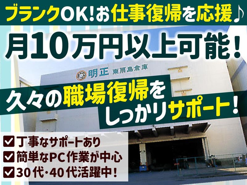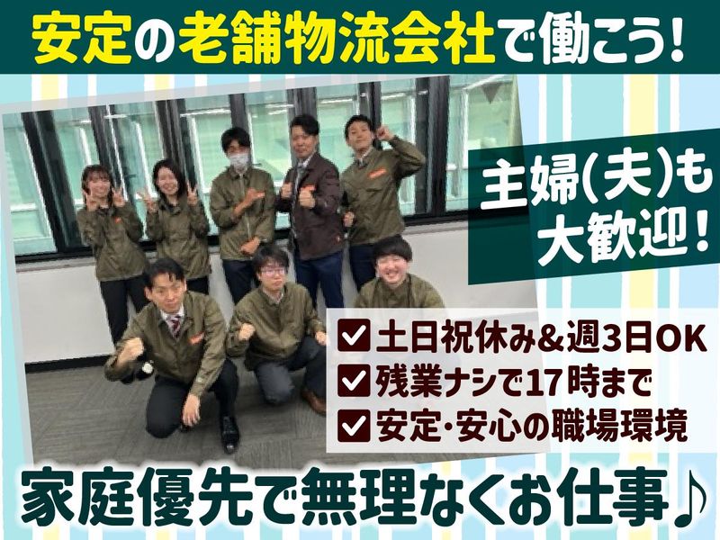 仕事内容 / 倉庫内での事務のお仕事! *データ入力 *伝票作成 *電話応対 *メール対応など 簡単なPC操作がメイン♪ \ ✅月・水・金の週3日 ✅曜日・時間の相談OK! ✅交通費全額支給 ✅30代、40代が活躍中! ✅家庭との両立も応援◎ / 未経験&ブランク歓迎! 週3日×簡単な事務 収入目安は「月10万円~」♪ \ ⭐・:・⭐・:・⭐・:・⭐・:・⭐・:・⭐ \\\|| ||/// >>>時給1300円<<< ✧特別なスキルは必要なし✧ ///|| ||\\\ 未経験の方や、 ブランクのある方も大歓迎! 丁寧に教えることをお約束◎ 「そろそろ仕事復帰したい」 「安定して収入を増やしたい」 「家事と両立しながら働きたい」 「事務に挑戦してみたい」 是非、お気軽にご応募ください! ┏ ━━┅━━━━┅━━ ┓ ❯❯❯❯[ご注目]|•'-'•)੭ ┗ ━━┅━━━━┅━━ ┛ 創業75年の老舗物流会社だから 安心・安定の職場です☆彡 声を掛け合ったり、 助け合うのが当たり前! 親しみやすく、 優しさ自慢の職場だから あなたもスグに馴染めること 間違いなし!(,,ò᎑ó,,)♪