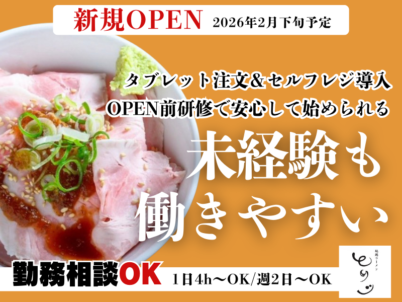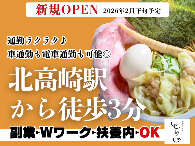 仕事内容 ✼••┈┈┈┈••✼••┈┈┈┈••✼ ✨26年2月下旬OPEN✨ 地鶏ラーメン とりじ オープニングスタッフ募集 ✼••┈┈┈┈••✼••┈┈┈┈••✼ 新しい仕事を⭐ 新しい環境で⭐ 新しい仲間と⭐ 一緒に始めてみませんか? まったくの未経験も大歓迎です❗ ✅仕事内容  ̄ ̄ ̄ ̄ ̄ ̄ ̄ ̄ ̄ タブレット注文やセルフレジを 導入しています。 飲食・接客未経験の方も安心です♪ 主なお仕事は ▶席へのご案内 ▶料理の提供 ▶食器・テーブルの片付け ▶店内の清掃 など をお願いします。 お仕事にブランクある方や バイト初めての方も 安心して始められますよ◎ ✅採用担当者より  ̄ ̄ ̄ ̄ ̄ ̄ ̄ ̄ ̄ 女性のお客様も多い 前橋にある地鶏ラーメンとりじが 北高崎駅近くに新たにオープン いたします。 落ちついた店内で 無化調の優しく味わい深い 地鶏出汁のラーメンを 提供しています。 オープニングするにあたって 一からスタートする方にも 安心して始められるように オープン前研修期間もあります。 先輩社員もフォローいたしますので 少しでも興味ある方はお気軽に ご応募ください。 ✅こんな方が活躍中  ̄ ̄ ̄ ̄ ̄ ̄ ̄ ̄ ̄ ̄ ̄ 他店舗ではこんな方も活躍中❗ └✧平日は… ▶お子さんが学校へ行っている間だけ働きたい ▶子育てが落ち着いたので働きたい ▶家庭を優先したいから昼だけ働きたい そんな働くママさんや主婦さんが活躍中♪ 急遽のお休みなども みんなで助け合いながら働いてます◎ └✧土日祝は‥ ▶学校が休みの日だけ働きたい ▶Wワークで働きたい ▶土日のみで集中して効率的に働きたい 限られた時間を活かして お小遣い稼ぎをしている方もいます◎