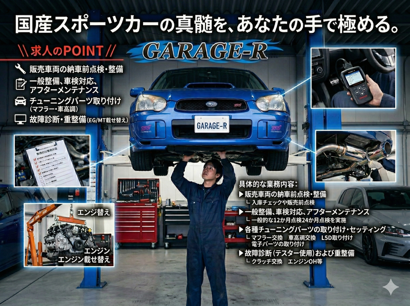 仕事内容 「好き」を仕事に。伝説の名車から最新スポーツカーまで。 スカイラインGT-R、シルビア、RX-7、ランエボ、インプレッサなど、国産スポーツカーを中心とした点検・整備・チューニングをお任せします。 具体的な業務内容: \\求人のPOINT// ⏩販売車両の納車前点検・整備 └入庫チェックや販売前点検 ⏩一般整備、車検対応、アフターメンテナンス └一般的な12か月点検24か月点検を実施 ⏩各種チューニングパーツの取り付け・セッティング └マフラー交換 車高調交換 LSD取り付け 電子パーツの取り付け ⏩故障診断(テスター使用)および重整備(エンジン・ミッション載せ替え等) └クラッチ交換 エンジンOH等 <ここがポイント> 一般的な車検センターとは違い、一台一台のコンディションと向き合う「深い整備」が可能です。あなたのこれまでの経験とスキルを、 価値ある名車たちを守るために活かしてください。 ┈┈┈┈┈┈┈┈┈┈ ■具体的な仕事内容 ┈┈┈┈┈┈┈┈┈┈ ✅ 入庫してきた車の入庫チェック ✅ 販売に向けた整備 ✅ 納車前の点検 ✅ チューニングパーツの取り付け ✅車検ライン通し ┈┈┈┈┈┈┈┈┈┈ ⭐ 1日の業務の流れ ┈┈┈┈┈┈┈┈┈┈ ⏰ 9:45 清掃 ↓ ⏰ 11:00 入庫チェック ↓ ⏰ 14:00 整備 ↓ ⏰ 16:00 部品発注手配 ↓ ⏰ 18:30~ 退社 効率重視の働き方で、残業も少なめです。 ◤ 会社紹介 ◢  ̄ ̄ ̄ ̄ ̄ ̄ ̄ ̄ ̄ ̄ ̄ ̄ ̄ ̄ ̄ ̄ ̄ ̄ ̄ ̄ 埼玉県三郷市を拠点に、中古車の 査定・買取を専門に手がける当社。 なかでも国産スポーツカーを中心に 扱っています。 ★認証工場取得★ RB26、13B、4G63、EJ20 SR20 1JZ 4AG B16B……。 この、文字を見てワクワクするあなた当社で一緒に働きましょう! 最高のコンディションへと導くのがあなたの使命です。 一般的な整備にとらわれる事なく、 車のポテンシャルを最大現に発揮させる! 「マニュアル外」の技術が身につく: 現行車の部品交換だけでは終わらない、旧車特有の知恵と工夫が必要なシーン。 あなたの培ってきた整備士のスキルが、ここでは「真の技術」へと昇華します。 圧倒的な車種ラインナップ: スカイラインGT-R(R32/33/34)、シルビア(S13/14/15)、RX-7、スープラ、ランエボ、インプレッサ……。 憧れのスポーツカーが、あなたのピットを埋め尽くします。 「走る喜び」を支える誇り: 納車を待ちわびるオーナー様の笑顔。 その裏にあるのは、あなたの完璧な整備です。 スポーツカーのプロとして、一生モノのキャリアを築ける環境がここにあります。