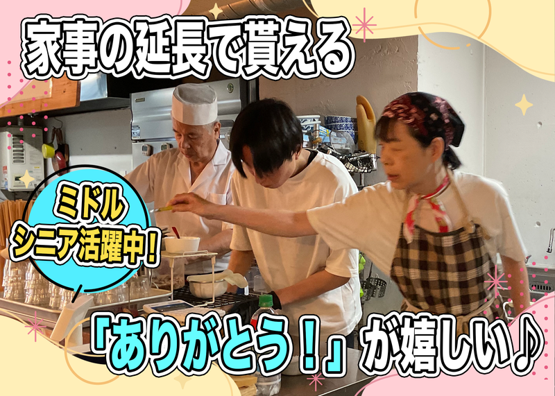 仕事内容 ★2月からの勤務開始もOK!★ 平日のお昼だけ・週3、4日~OK! 主婦さん多数在籍!60代の方も活躍中♪ セルフスタイルのうどん屋さんで アルバイト・パートさん募集! =============== 「年齢を気にせず、無理なく始められます◎」 家事の延長のような内容なので、 お仕事が久しぶりの方や、60代の方も安心して始められます。 \体に負担の少ない、シンプルな作業からスタート/ お客さんが窓口で注文 ↓ 天ぷらを取る ↓ レジで受け取る …というセルフスタイルなので、配膳はありません! 盛り付け(うどん・おにぎり)やレジが中心のお仕事です。 その他にも、テーブル拭きや食器洗い、片付けなどもお願いします。 研修あり・丁寧にお教えしますので、未経験でも大丈夫です! 天ぷら・揚げ物の調理経験がある方は大歓迎。 これまでのご経験を活かして、即戦力としてご活躍いただけます。 もちろん、経験年数やブランクについてもご相談ください。 =============== <50代主婦スタッフ> 「子育てが落ち着いた頃に始めて、気づいたらもう10年以上! 優しい仲間と、無理のない働き方だからこそ続けてこられました。 お昼だけなので夕飯の準備にも間に合って助かっています。」 =============== 【お店の紹介】 伏見駅近くにある、会社員や地元の方に長年愛されるうどん店です。 スタッフ同士の雰囲気もよく、10年以上働いている50代の主婦さんも在籍中! 「久しぶりに働くのは不安だったけど、ここは安心して続けられる」 そんな声が多く、落ち着いた環境で長く働ける職場です。 \まかない無料!お店の人気メニューが味わえます♪/