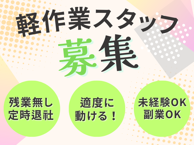 PR・職場情報 ★時給1350円で安定収入 ★月収25万円以上も可能 ★コツコツ作業で安心 ★公共バスで通勤ラクラク ★駅からバスで約10分 ★長く働きやすい環境です 求人の特徴 \ 来社不要の電話面接 / ▽平日の日中~夜、土日祝でも面接枠をご用意! ▽働いている方でもご自身の予定に合わせて面談予約ができます! ▽まずは登録だけでもOK!あなたに合ったお仕事をご紹介します! <<応募から就業までの流れ>> 応募から就業まで平均1~2週間!応募後すぐ働けます♪ STEP1 WEBにてご応募 *応募後に届く面接予約のご案内メールより面談予約をお願いします ※既にご登録いただいている方は書類選考のご案内メールをお送りします ↓ STEP2 面接担当とお電話で面接 *お仕事の詳細説明や簡単なヒアリングを行います ↓ STEP3 職場見学 *実際に働く職場を見学できます ↓ STEP4 入社手続き *契約内容の確認や安全教育等を行います ↓ 就業スタート! *入社初日は営業担当も同行します 求人ポイント 高収入・高月給,交通費支給,即日勤務OK,急募,週5~6日からOK,副業・WワークOK,主婦・主夫歓迎,長期,フリーター歓迎,バイク通勤OK,給料前払いOK,大量募集,学歴不問,車通勤OK,残業月20時間以内,平日のみOK,転勤なし,未経験者歓迎,経験者歓迎,週払いOK,リモート面接OK,研修あり,社会保険完備,制服貸与,50代以上応募可,ブランクOK,禁煙・分煙,即日払いOK,長期休暇あり,ピアスOK,服装自由,40代以上応募可,履歴書不要,寮・社宅あり,ひげOK,髪型・髪色自由,週5からOK,外国人活躍中,固定時間制