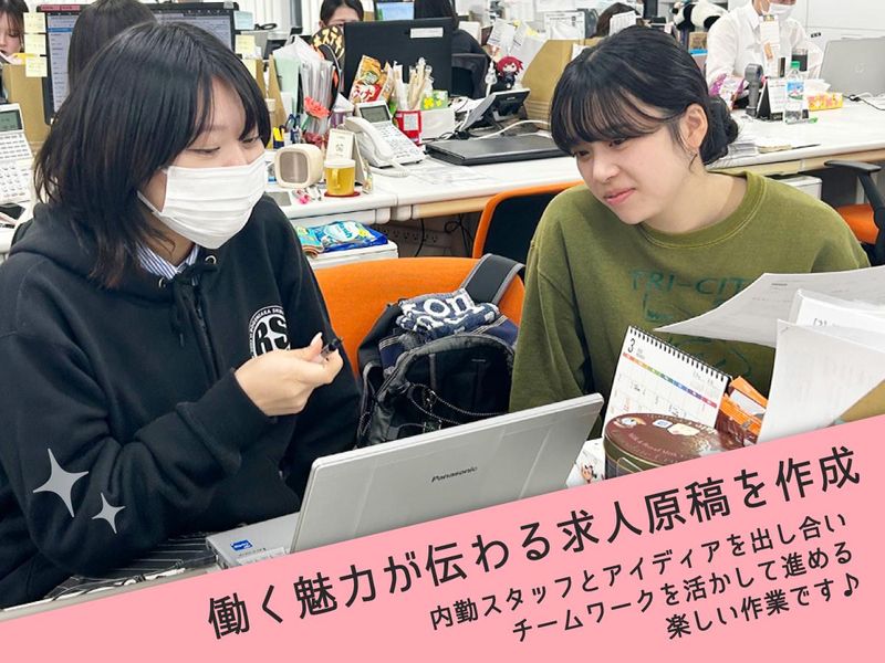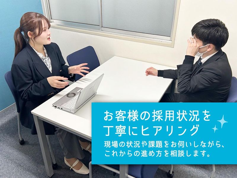 仕事内容 Indeed・WEB広告・販促チラシなど さまざまな手法で、企業・お店・法人の 「人材採用」や「人事課題解決」に関する サポートをしている私たち。 『人材採用のプロ』として 採用でお困りのお客様へご提案を行う、 “人材営業”のお仕事です。 ー・-・ー・-・ー・-・ー・-・ー・- \\ ✨お仕事の流れ✨ // 1.ご案内(TEL、メール、訪問) 配属されたエリアのお客様を中心に 採用状況やお困りごとがないかを 確認し、必要に応じてご提案の機会 (アポイント)をいただきます。 ▼ 2.ヒアリング・取材 市場感やトレンドをお伝えしながら お悩み・ご要望を丁寧にお伺いします。 ▼ 3.ご提案(プレゼン) お伺いした内容をもとに解決策を立案! デザイン・制作担当のスタッフと一緒に 写真撮影・原稿作成などに関わる機会も たくさんあります。 ▼ 4.掲載スタート+伴走 発注いただいた求人の応募状況を お客様と一緒に確認しながら、 応募・面接・採用までを しっかりサポートしていきます! ー・-・ー・-・ー・-・ー・-・ー・- ╭──────────・★・・─╮ この仕事のやりがいについて 営業スタッフに聞いてみました ╰─・・★・──────────╯ ■ 自分の“ファン”を増やせる ■ 人事のプロフェッショナルをめざせる ■ 物売りではなく「課題解決」がお仕事 ■ 自分の仕事や成果が目に見える ■ 興味がある業界で人脈づくりも 『あなたに頼んでよかった!』と お客様から感謝の言葉をいただけることも。 やりがいや介在価値を感じる瞬間です! ー・-・ー・-・ー・-・ー・-・ー・- \\ ✨私たちについて✨ // 渋谷区・道玄坂の真ん中にオフィスを置く 総合求人広告代理店です。 Indeedやしゅふjobなどの 求人メディアを中心に 地方メディアや他媒体などを駆使して 企業・お店の「採用のお手伝い」を 行っています。 ー・-・ー・-・ー・-・ー・-・ー・-