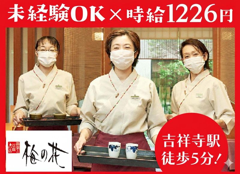 仕事内容 ⭐この求人のおすすめポイント⭐ ☑週2日・1日3時間~OK ☑シフトは融通します ☑土日祝は時給50円アップ! ☑吉祥寺駅から徒歩5分 ☑ライフスタイルに合わせた勤務 ☑綺麗で落ち着いた和食店 ☑未経験も安心の丁寧な研修 懐石料理店「梅の花」のホールスタッフを大募集! 未経験の方も大歓迎です! 【仕事内容は】 ・予約席のセッティング ・受付応対 ・お席へのご案内 ・お茶出し、オーダー伺い ・配膳・料理やドリンクの提供 ・ドリンク作成 ・テーブルの片付け ・お会計など <<梅の花 吉祥寺店>> 湯葉と豆腐をベースにした創作懐石料理店。 落着いた綺麗な店内は高級和食店を彷彿させます。 リーズナブルな料金で高級感を味わえると 女性のお客様を中心にご支持を頂いています。 *************** 未経験から育てるノウハウと 働き易さ抜群の職場 *************** 入社後、最初にすることは お客様としてお店での食事体験です。 梅の花を自分の肌で、そして自分の舌で お店全てを体感していただきます。 次に、動画やテキストを使った 座学で、お店のことや業務の 基本を学ぶことからスタート☆ その後、現場に入り実際の業務を 先輩に教わりながら身につけていきます。