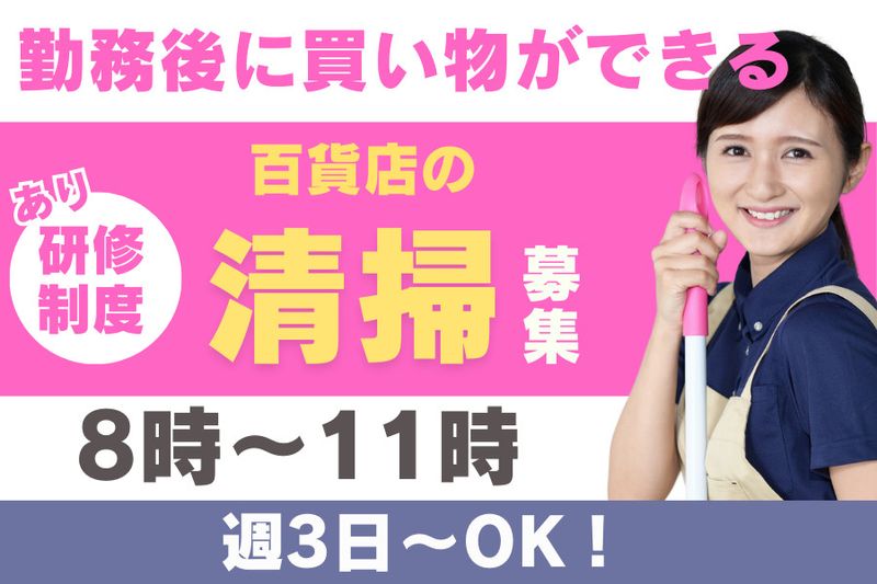 【仕事内容】 \勤務後に買い物して帰れます◎/ ✨百貨店の清掃スタッフを募集✨ バス停「泉町1丁目」よりすぐ! 百貨店で11時までの勤務なので、 お仕事帰りに買い物ができて便利! 【仕事内容】 ・床の清掃 ・窓ガラスの清掃 ・トイレの清掃など ✅未経験OK! 簡単なお仕事なので、未経験でも 全然問題ありません! 利用者から、「ありがとう」という 言葉がもらえる素敵なお仕事です。 【求人ID-A0018-1】