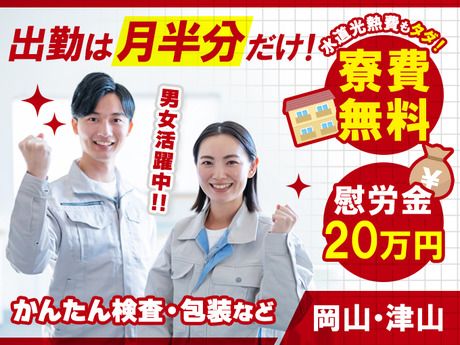 仕事内容 _/_/お仕事について_/_/ 津山市*東津山駅から車で5分☆未経験歓迎! スマホの操作用スイッチなどを作る工場で「検査」のお仕事! ・完成品(約3ミリ)を顕微鏡を使って検査していただきます。 リールにまかれている完成品をほどきながらの検査 検査完了後、リールに巻き直して包装 ※包装が終わったら再度検査作業を繰り返します♪ ー ◆高時給1400円!月の半分以上はお休み♪ ◆こつこつ作業がお好きな方に◎座り作業で楽チン♪ ◆未経験OK!幅広い年代の男女が活躍中☆ ◆寮費無料(水道光熱費・駐車場代含む)の寮完備!徒歩・自転車圏内で通勤もラクラク♪ 車載用のスイッチなどを作っているパナソニック工場で「検査」のお仕事です! ・完成品(約3ミリ)を顕微鏡を使って検査していただきます。 - リールにまかれている完成品をほどきながらの検査 検査完了後、リールに巻き直して包装 包装が終わったら再度検査作業を繰り返します♪ - あせらずモクモクお仕事を進めることができます! うれしい高時給1400円! 平均15日しか勤務しなくても月収23万円が可能☆ 働く職場には社員食堂もあり◎ 今なら慰労金20万円支給&寮費無料の寮も用意しています! 新生活を始めたい方にもおすすめです♪ _/_/ココがおすすめPOINT_/_/ ◆高時給1400円!月の半分以上はお休み♪ ◆こつこつ作業がお好きな方に◎座り作業で楽チン♪ ◆未経験OK!幅広い年代の男女が活躍中☆ ◆寮費無料(水道光熱費・駐車場代含む)の寮完備!徒歩・自転車圏内で通勤もラクラク♪ <<お友達紹介制度があります>> ・・・・・・・・・・・・・・・・・・・・・・・・・・・・・・・・・・ 当社にご入社後、お仕事をお探し中のご友人・知人をご紹介いただいて、 その方が当社にご就業いただければ、 ご紹介1名につき5万円をお支払い致します!(一定期間ご就業後/規定有) ※ご紹介いただけるのは当社に在籍中に限ります ※他拠点での勤務の場合も対象になりますので県外のご友人でもOK! _/_/特典・キャンペーン有_/_/ ★慰労金20万円(規定あり) ★生活備品付き1R寮の家賃が永年無料!(寮費補助制度)