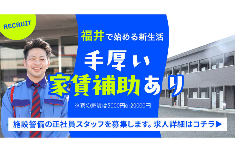 仕事内容 発電所内外の安全を見守り、地域のみなさまの安心をつくりだすお仕事です。発電所のルールに基づいて警備業務を行います。 メイン業務は日勤シフトor夜勤シフトで少し異なります。 午前は、各所より、扉やゲートなどの開閉依頼があった場合の対応をする呼び出し業務と各種申請書類の確認業務が中心になります。 午後は、敷地内の異常がないかを確認する敷地内の巡回業務、出入りの多いゲートに配置して扉の開閉を行い、出入りの管理業務も行います。その合間に、申請書類の確認業務も行っています。 警備のお仕事は、定型した業務が多いです。巡回・ゲートの開閉や、申請書類の確認などが主な業務です。だからこそ、大切にしているのは、「リスクに備えること」。警備の資格を取得し、知識を得て、ひとつひとつの業務を実直に遂行していくことです。まずは経験・知識は不要です。私たちが大切にしている想いに共感いただける方に、このお仕事をお任せしたいと思っています。 【働き方について】 巡回や出入りする方の管理、申請書類の確認が主な業務になります。 働く仲間は、子どもの頃警察官や消防士に憧れていた...そんな方が多いかもしれません。 入社後は、必要な資格「施設警備業務検定2級」にチャレンジし、知識と経験を積んで安定的に勤務できます。 お休みは夜勤(月7~10日)があるので月4~6日になりますが、その分しっかりと手当で還元されます。 資格取得に関する費用と取得後の手当も付くのが魅力です。 当社の定年は61歳ですが、その後嘱託にて再雇用が可能!40~50代の方も活躍頂いています。 職種や職場も幅広いお仕事がございますので、定年後もスキルや年齢に応じたお仕事のご相談も受け付けています。 【働く環境】 職場となる発電所には、休憩室や社員食堂(日中のみ)、自動販売機も設置されているのでしっかり休憩をとることができます。 また社員寮には全室トイレとお風呂が付いており、共用の洗濯機・乾燥機を設置しています。 小浜と敦賀は8畳の寮、おおい町は2023年6月初旬竣工入寮開始です。 どの寮も近隣スーパーから徒歩や車で5分と近く、オフの日も快適に過ごせる環境です。 お休みは平日休みが多いですが、希望日の相談もOK! 皆さん趣味の釣りや映画など、しっかりメリハリをつけてリフレッシュされています。 【AIVIXについて】 AIVIXは50年以上の歴史がある安定した企業です。 福井を中心に全国24拠点、主に富山・滋賀・京都・大阪・千葉・東京のエリアにおいて、受付・事務・清掃・警備・設備管理・施設管理・営業等のさまざまな職種をご案内しています。 未来に向けたIT/機械での警備技術やロボットの導入なども積極的に行っており専門性も高く、知識やスキルを取得するため、チャレンジしたスタッフは昨年613名、資格取得件数は1727件と日々励んでいます。 取得後の手当もあり、スキルUPによる評価もありますので、安定的に収入を上げて安心したライフスタイルを実現できる環境です。 【プライベートは自然に癒やされリフレッシュ】 発電所は海のすぐ近く。 仕事を終えたらすぐに釣りを楽しむことができ、釣り好きのスタッフからとても好評です。 また釣りの穴場が多いのも魅力です。 敦賀発電所近くには、「水島海水浴場」があり、北陸のハワイとまで言われるほど美しいエメラルドグリーンの海と白い砂浜が広がっています。 水島へは、7月と8月に観光船で渡ることも可能です。 休日は自然環境でしっかりリフレッシュし、気分を切り替えられるので、仕事にも熱意をもって取り組むことができます。 【貯金&趣味への投資がしやすい環境】 10~20代スタッフは入社時から、夜勤分の収入UPがあるので周りの友人たちより月収は多いです。 発電所で働く24歳スタッフの月収は28万円。 寮を利用するスタッフが多く家賃負担も少ないため、手取りが多いのが魅力! 貯金したり、趣味に使ったりと充実しています。 スタッフ間も、フランクに話せて親しみやすい雰囲気。 社内成人式があり、会社のみんなでお祝いするなど、若手を大切に育てる環境です。 【地域をスタッフみんなで守っています】 アイビックスでは会社の警備車に「こどもの安全や街の安全の為に見守り協力企業」としてステッカーを貼り、業務にあたっています。 アイビックスには様々な職種がありますが、「誰かのためになる仕事」「安全をつくる仕事」として、地域の皆様に選ばれています。 先輩スタッフには、スポーツ部の経験者が多く、過去のインターハイ選手も活躍しています。 どの職種のスタッフもやりがいを持って勤務しており、ステップUPのため資格取得にも励んでいます。