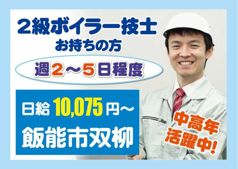 仕事内容 【飯能市双柳】公共施設の空調設備保守管理要員★日給10,075円~★日勤のみ★週2~5日程度★2級ボイラー技士をお持ちの方 ★公共施設で安定して働けます! ★中高年活躍中 ・電気・空調設備の保守点検 ・各機器の運転及び保守管理業務 ・定期点検(月次点検、年次点検、年間スケジュール、等の作成) ・施設内の照明やスイッチなどの修繕業務 ・その他故障不具合への対応 アピールポイント 30代・40代・50代・60代の男性スタッフが活躍中! 60歳以上の方も歓迎! 中高年の方も働きやすい職場環境です。 日勤のみのお仕事です! プライベートの時間も大切にしながら働けます。 資格を活かして働きませんか!