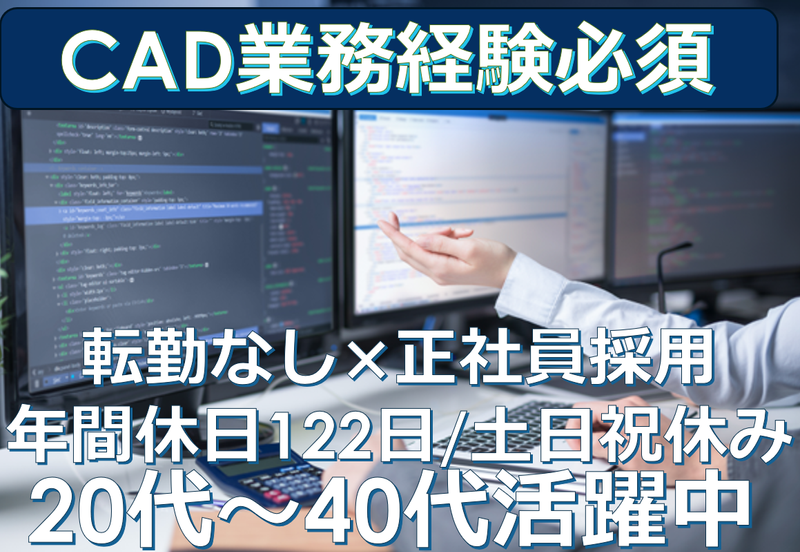 求めている人材 <必須条件> ・CADの使用経験がある方 <歓迎条件> ・2D、3DCADソフト経験のある方 ✨資格やスキルについては、充実した研修制度があるので着実にスキルアップできます。