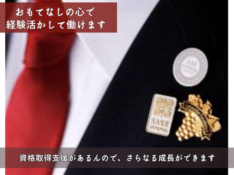 求めている人材 ◎ソムリエ(日本ソムリエ協会)資格必須 ◎ソムリエ経験者 ソムリエ・ワインエキスパート・ WSET・Sake Diplomaなど 有資格者は優遇!経験者歓迎! ◎日本語での日常会話が可能な方 (日本語検定N1以上) ◎未経験OK! ◎ブランクOK ◎フリーター歓迎!主婦・主夫歓迎! ※独立希望の方も大歓迎! <こんな方も歓迎します!> ・ワインや日本酒が好き ・京料理や日本文化に興味がある ・落ち着いた環境で接客したい ・経験を活かしてもう一段ステップアップしたい ・英語活かせる接客がしたい