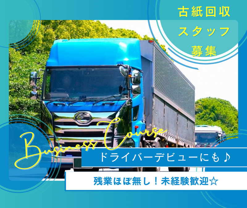 仕事内容 -アピールポイント- ✅【未経験歓迎!】 年齢・学歴・経験不問! ブランクのある方もOK! ✅【ドライバーデビューにも】 丁寧な研修でイチから しっかりサポート! ✅【体も動かせて気分転換にも!】 運転と倉庫内作業の バランス◎ ✅【プライベートも充実!】 残業ほぼなしで ワークライフバランスも◎ |◤ お仕事内容 ◢|  ̄ ̄ ̄ ̄ ̄ ̄ ̄ ̄ ̄ ̄ ̄ ̄ ̄ ̄ ̄ ̄ ̄ ̄ ̄ ● 4tトラックでの古紙の回収・ 選別作業 具体的には… ◆ 古紙の回収 └ 4tトラックで物流会社や新聞社などの 得意先へ向かい、古紙を回収します。 ◆ 古紙の選別 └ 回収した古紙を、倉庫内で 選別する作業です。 *ずっと運転するだけではなく、 程よく体を動かせるので 気分転換にもなります! 【職場環境】 ◆ 未経験からスタートした先輩も 多数活躍中! ◆ 知識や経験は一切問いません。 ⭐経験・スキルを問わずに 活躍可能⭐  ̄ ̄ ̄ ̄ ̄ ̄ ̄ ̄ ̄ ̄ ̄ ̄ ̄ ̄ ̄ ̄ ̄ ̄ ̄ ドライバーや運送業が初めての方も ご安心ください! 中型免許があればOK。 平成19年6月1日以前に取得した普通免許でも応募可能です。 イチから丁寧に指導します。 わからないことがあっても、 先輩スタッフがしっかりサポート するので、安心して業務を始められます。 ⭐1日のスケジュール例⭐  ̄ ̄ ̄ ̄ ̄ ̄ ̄ ̄ ̄ ̄ ̄ ̄ ̄ ̄ ̄ ̄ ̄ ̄ ̄ ▼08:00 出社・朝礼 ▼09:00 古紙の回収 ▼13:00 倉庫内で古紙を選別 ▼16:00 事務作業・翌日の準備 ▼17:00 退社 ⭐キャリアアップについて⭐  ̄ ̄ ̄ ̄ ̄ ̄ ̄ ̄ ̄ ̄ ̄ ̄ ̄ ̄ ̄ ̄ ̄ ̄ ̄ 昇給の機会があり、頑張りは正当に 評価します。 業務に慣れてきたら、 一人ひとりのスキルや経験に応じて、 できる業務の幅を広げていくことができます。 ⭐会社紹介⭐  ̄ ̄ ̄ ̄ ̄ ̄ ̄ ̄ ̄ ̄ ̄ ̄ ̄ ̄ ̄ ̄ ̄ ̄ ̄ 当社は、古紙の回収を通じて、 リサイクル社会の実現に貢献している 会社です。 環境に配慮した事業は、 今後ますます社会から必要とされて いきます。 安定した環境で、社会に貢献できる やりがいのある仕事を始めませんか?