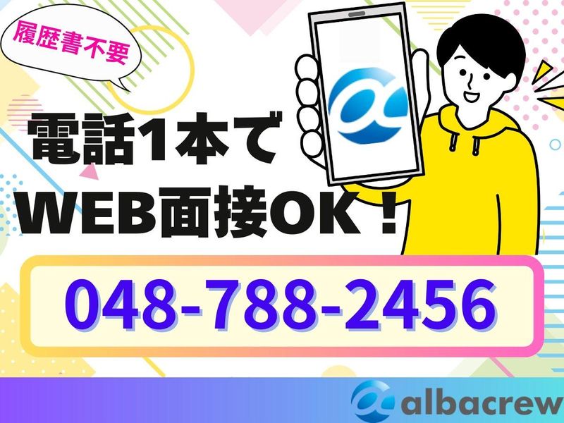 選考プロセス ここまでお読み頂き 有難うございます 【選考の流れ】 (1)WEBまたは電話にて応募 TEL:048-788-2456 (2)応募後、24時間以内に 採用担当よりご連絡を差し上げます (048-788-2456 ご登録下さい✨) (3)登録会 3パターンからお選び頂けます♪ ★WEB面接(登録) ★現地面接(最寄駅でもOK) ★来社登録▼ 埼玉県さいたま市大宮区仲町2-80-1 KS-DIOビル105 (4)面談・職場見学 (5)お仕事開始 *選考完了までの目安は7日間ほどです