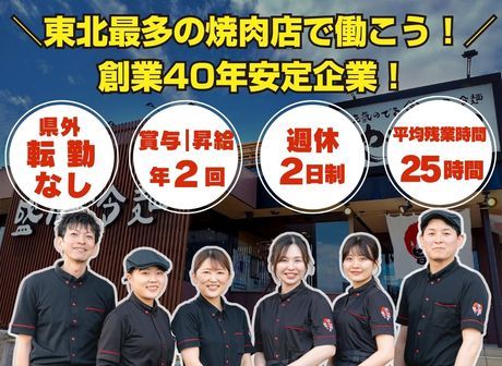 仕事内容 キャリアに応じた研修!定期的な面談「がんばり」を見える化! 「正社員で安定して働きたい」 「家族を養える職場を探している」 そんな方に選ばれているのが、やまなか家です。 創業から40年以上、東北に根ざして飲食事業を展開し、 現在では60店舗以上(FC店含む) 従業員1300名規模の企業へ成長。 地域密着型、お客様に愛されるお店を目指しています。 ―――――――――― ●具体的なお仕事内容は? ―――――――――― ・お客様を席へ案内・オーダー取り ・ドリンクづくり・配膳/下膳 ・調理(ビビンバや盛岡冷麺等) ・レジ打ち・食器洗い ・仕込み業務(お肉や野菜など) ・アルバイト教育など 店舗での実務を覚えたら、 以下のような管理業務を徐々にお願いしていきます。 ●店舗管理業務(経営感覚を養う) 食材・備品の発注、在庫管理、 売上管理、日報作成など 店舗の数字を把握し、改善策を考える管理業務。 ●衛生管理 店舗の清掃や設備管理を通じて 常に衛生的で快適な環境を維持。 ●店舗プロモーション・改善 売上目標達成に向けた戦略の立案・実行や お客様の声を活かしたサービス改善など 能動的に店舗を盛り上げる業務にも携わります。 ★年2回の成長評価制度  ̄ ̄ ̄V ̄ ̄ ̄ ̄ ̄ ̄ ̄ ̄ ̄ 当社の人事評価は半年の実績を振り返るだけでなく 人材育成を目的としています。 顧客満足度指標であるQSCAを重視し 売上などの外的要因に影響されず、 行動や取り組み姿勢を評価するプロセス評価を採用しています。 社員アンケート普通+満足度97%以上! ★スタッフの声(一部)を紹介  ̄ ̄ ̄V ̄ ̄ ̄ ̄ ̄ ̄ ̄ ̄ ̄ ●以前よりも休みがとりやすく、家族の時間が増えた ●自分の力を発揮できていると感じる ●キャリア毎の勉強会もあるので成長を感じる ●多くの仲間に助けてもらいながら働くことができている ●充実した日々を過ごせている ●自分の努力をしっかり見てくれている ●多くの仲間に助けてもらいながら働くことができている ★動画で会社を知ろう★  ̄ ̄ ̄V ̄ ̄ ̄ ̄ ̄ ̄ ̄ ̄ ̄ ●KYコーポレーション紹介動画はこちら https://youtu.be/6YBfAui4X2Q/index.html ●リクルート会社情報ページはこちら https://www.ky-group.jp/recruit/index.html ★現場主導の店づくり  ̄ ̄ ̄V ̄ ̄ ̄ ̄ ̄ ̄ ̄ ̄ ̄ 当社はトップダウンではなく 現場の声を重視した店づくりを行っています。 店長に大きな裁量があり、自由にアイデアを実現できます。 「1人の100歩より、100人の1歩を大切にしたい」との思いがあります! 【スタッフの特色】 ・平均年齢は37歳 ・全体で10~50代後半の社員が活躍中! ・東北出身者が多数 関東からU・Iターンで入社した社員も ・前職は飲食業の他、印刷業界やホテル業界など様々 ※店舗社員人数はお店の広さにあわせ3名~5名勤務しています。 サポート体制もバッチり★