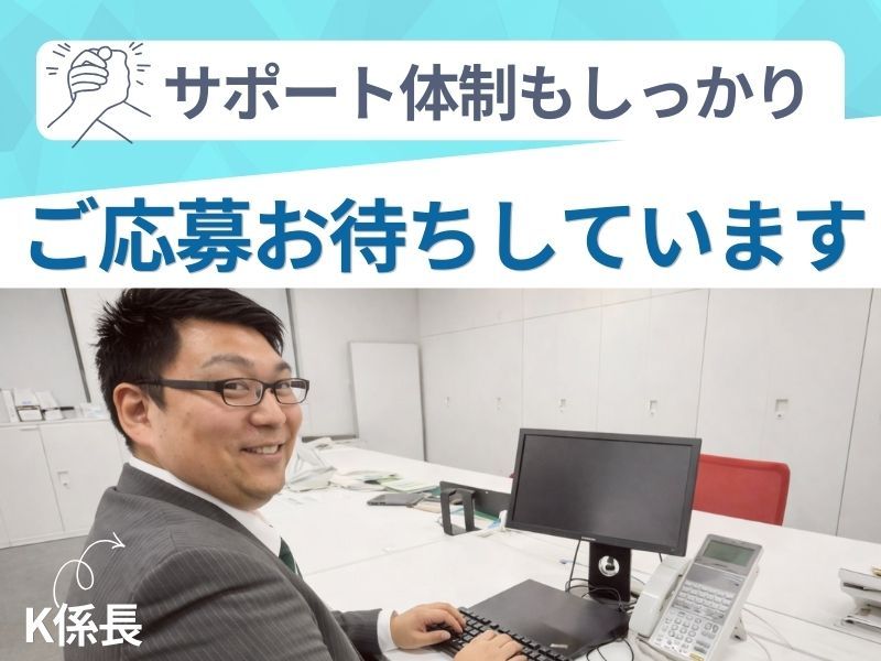 仕事内容: / 事務未経験OK 月給28万円スタート✧ 家電付き・家賃補助つきの社宅もあり! \ ◆土日祝休み&年間休日120日以上 ◆残業少なめ(30分~1時間ほど) ◆大手企業と取引多数!成長し続ける安定企業 ◆お菓子や珈琲・お茶が格安で楽しめる♪ <応募から最短3日で内定> 平日・土日どちらも面接OK◎ 応募資格は、 「ちょっと気になったから応募してみた」でOKです ………………………………… 【ご応募について】 WEB応募ならたった1分で完了! 電話応募は 080-5547-4942(採用担当)まで ………………………………… 【仕事内容】 電話応対やサポートセンターでの受付業務を中心に、 “現場が止まらないよう支える”お仕事です。 あなたのペースに合わせて、できる業務からお任せします。 <入社後の成長イメージ> ▼1年目/まずは基本業務からスタート ・データ入力 ・書類チェック ・電話、メール対応 ▼2年目以降/少しずつ業務の幅を広げます ・進捗の確認 ・他部署とのやり取り ・後輩のサポート などもお任せします ▼その先/キャリアアップも可能 チームをまとめるポジションや、業務改善に関わる役割で活躍する道もあります。