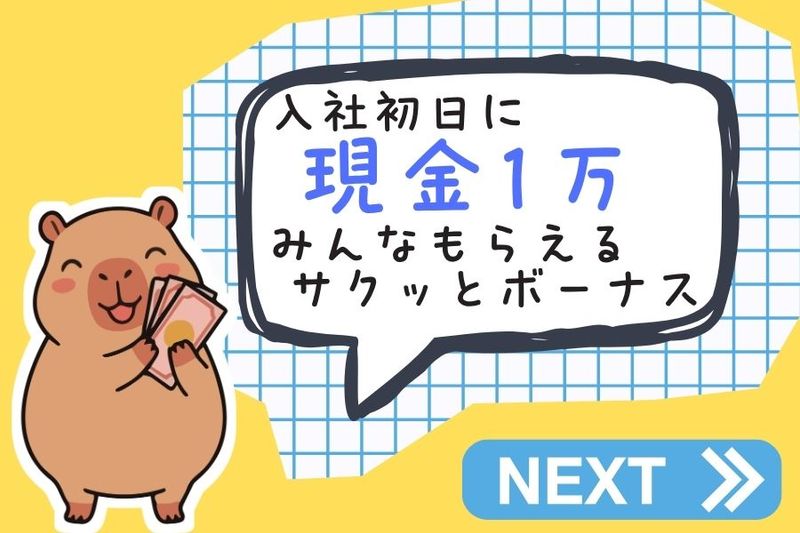 アピールポイント: /\/\/\/\/\/\/\/\/\ 入社時の特別支給「サクッと1万」開始 \/\/\/\/\/\/\/\/\/ 入社初日に「入社特典」をゲットしよう! 配属されたその場で「現金1万円!」 気になったらお気軽にお問い合わせください! 業績好調の大手メーカーで安心 * 昼は弁当やパンがスマホ1つで注文可 * 自販機/ロッカー/更衣室完備 * 長期就業可能 * クルマ、バイク通勤OK! * 土日祝休み * 空調完備の快適環境 * 作業服貸与あり(作業着での出勤もOK) * お弁当あり <日払い・週払い利用OK> \まるで毎日が給料日/ \\利用者急増中// \アプリで簡単申請/ お気軽にご相談くださいね!