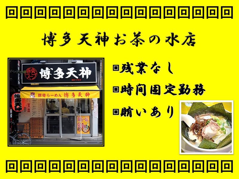 仕事内容 豚骨ラーメン「博多天神 お茶の水店」 麺類メニューのみを取り扱っているラーメン専門店です。 調理及び接客業務をお任せいたします。 遅番(19:00~翌4:00)固定の勤務で、残業はありません。 ★経験者は即戦力で活躍できます ★固定勤務なので生活リズムが安定します ★美味しい賄いや大入り手当あり \ 当店では50代が若手です! / 60代・70代など、中高年の方が主力の職場。 年齢を気にせず働きたいとお考えの方、ぜひご相談ください。 \ 経験をガッツリ活かせる! / ラーメン店・中華料理屋・台湾料理屋・居酒屋など 飲食店経験をお持ちの方は即戦力で活躍できます★ もちろん未経験の方も大歓迎です! \ 負担なく働けるように残業はなし / 早番・遅番のスタッフがそれぞれ固定で勤務しているので、 常に定時で上がれます。 お休みは週休2日制です。 希望を考慮して臨機応変に対応いたします。 長期休暇もあり!働き方についてはお気軽にご相談ください。
