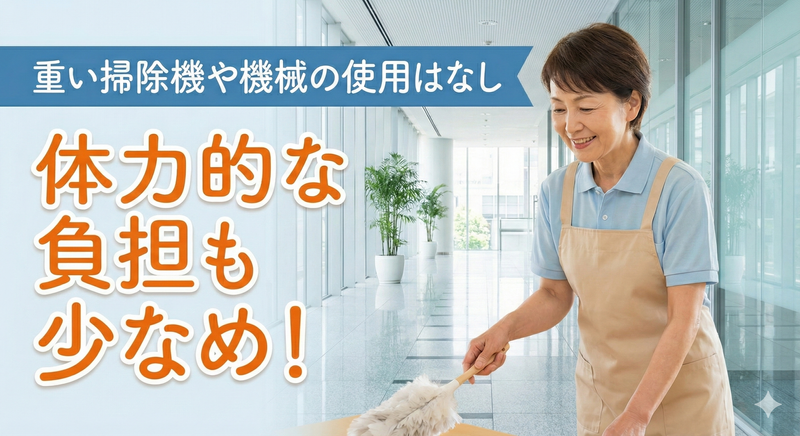仕事内容 大手企業本社の工場・事務所における清掃業務です。 作業は分担制で、決まったエリアをお一人で作業して頂きます。 普段の家事の延長でできる、シンプルで体力的な負担の少ない作業が中心です。 - 【体力的な負担が少ない理由】 ●重い掃除機や機械は使いません: 軽いモップや雑巾など、使い慣れた道具が中心です。 ●重労働・力仕事は一切なし: ゴミ回収も軽量なものがメインです。建物内の移動はエレベーターが中心で、重たいものを持っての階段移動はありません。 - 【POINT】 ★50代・60代スタッフがメインで活躍中! ★週2日~&1日3時間~5時間勤務! ★週5日勤務できる方歓迎! ★清掃業界未経験者も大歓迎!安心の研修あり ★ポートライナー「南公園駅」より徒歩5分!嬉しい駅チカ - 【具体的な仕事内容】 共有部清掃や食堂等の清掃をお任せします。 ◆玄関・廊下・階段のモップがけ ◆ゴミ回収 ◆トイレ・手洗い場清掃 など ☆自宅から現場への直行直帰となります。 ☆エレベーター移動あり ☆重たいものを持っての階段移動無し! ☆作業マニュアルがあって未経験の方も安心して始められます! ☆自転車通勤・バイク通勤もOK!(ご相談ください) - 【教育について】 まずは先輩が1つ1つ丁寧にお教えするので 未経験の方も安心してご応募ください。 -