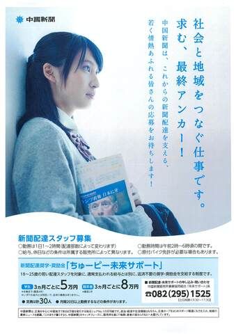 職種 新聞配達スタッフ(朝刊) 雇用形態 アルバイト・パート このような働き方も! ◆学生さんは、、、 「学業やサークル、趣味などと両立しながら働きたい」 ◆フリーターさんは、、、 「スキマ時間もしっかり稼ぎたい毎月決まったシフトで安定的に稼ぎたい」 「夕方までは別のバイトで、夜はココで働きたい」 「次の職場が決まるまでの間で働きたい」 ◆主婦(夫)さんは、、、 「扶養内&短時間・時短働きたい」 「パートをしながら家事・育児も疎かにしたくない」 「子育ても一段落してきたので、そろそろ職場復帰したい」 「学校行事や家族とのイベントは優先させたい」 「子どもの発熱時などシフトの相談にのってほしい」などなど あなたに合った働き方がきっと見つかるかと思います。 まずは、あなたの希望の働き方を教えてくださいね! 福利厚生・待遇 ・年1回の謝恩プレゼントあり ・交通障害、労働災害保険完備 ・大学生・専門学校生には給付型奨学金制度あり(支給には条件があります) 電話番号 0848-22-5830
