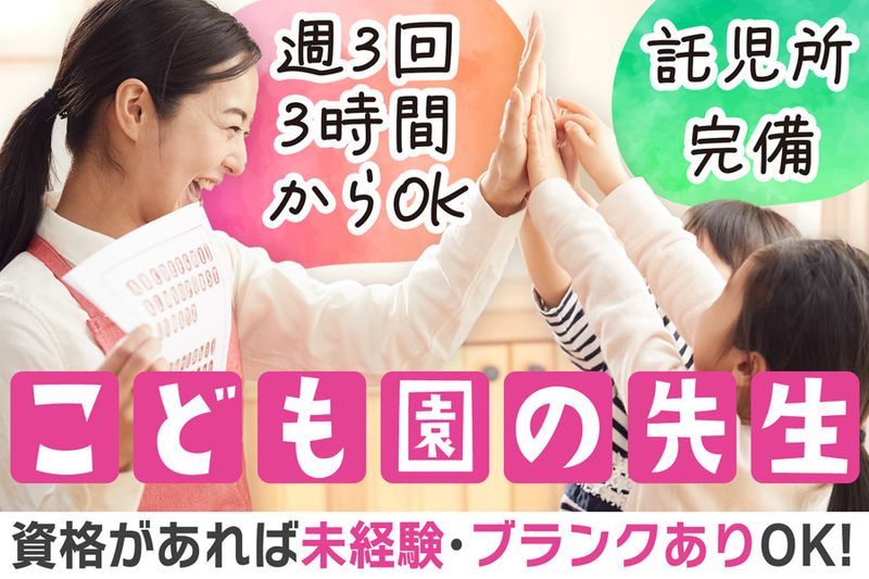 ✅平日のみOK✅入社時期相談OK✅週3日3時間からの勤務で託児所利用OK✅幼稚園教諭&保育士資格必須✅有給取得率100%✅車通勤OK