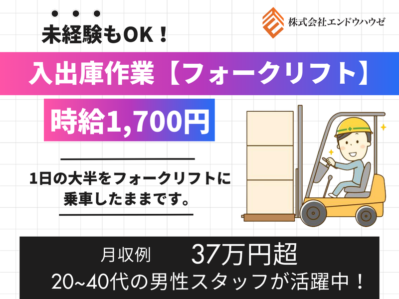 仕事内容 ★この仕事のポイント★ ✅ 時給1,700円+深夜・残業手当で月37万円以上可 ✅ 2交替制で生活リズムを整えやすい! ✅ 土日祝休み&長期休暇あり(GW・夏季・年末年始) ✅ 資格を活かして安定勤務/20代〜40代男性活躍中 ★仕事内容★ フォークリフトを使った入出庫・構内物流作業です。 乗車業務がメインで、以下の作業を担当します。 ■フォークリフト乗りっぱなしの作業になります■ ・原料(段ボール用紙)のライン供給 ・完成品の倉庫搬送・出荷エリアへの運搬 ・トラックへの積み込み作業 ・空いた時間にラップ巻き作業、ガス交換作業 など ※使用するのはカウンターフォークリフトです。 ※入社前に職場見学あり。業務詳細は担当者が丁寧にご案内します。 ■急募