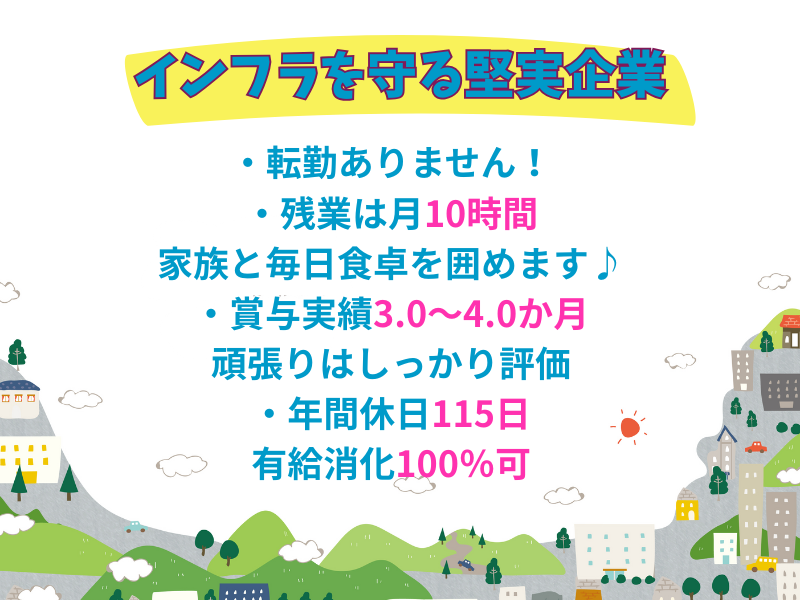 求めている人材 高卒以上 普通自動車免許(AT限定可) 未経験者大歓迎 ☆20代・30代活躍中 まったくの未経験者も活躍しています! はじめての就職も歓迎 ◎現場作業・土木業・配管工経験者も もちろん歓迎いたします。 ・プライベートとの時間も大事にしたい ・堅実な会社で腰を据えて働きたい ・技術を身につけられる仕事がしたい そんな方にはぴったりの職場です!