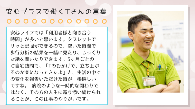 仕事内容 \ 「できた!」の喜びに、一番近くで / ⭐ 病院のその先へ。生活の場でのリハビリ ⭐ 日曜定休+GW・お盆・年末年始連休! ⭐ 有給消化率71.2%で実質年休123日も! ※年間休日114日+平均有給取得日数 ●=======●〇●=======● 「着替えが自分でできた」 「料理がまた作れた」 日常の何気ない「できた!」を支える。 それが、安心プラスの作業療法士の仕事です。 病院でのリハビリとの違いは、利用者様の 暮らしそのものに寄り添い、長期的な関係を 築きながら変化を見届けられること。 「その人らしい生活」を再建するプロとして、 あなたの専門性をここで活かしませんか? ●=======●〇●=======● ✅具体的なお仕事内容  ̄ ̄ ̄ ̄ ̄ ̄ ̄ ̄ ̄ ̄ ̄ ̄ ̄ ̄ ̄ ̄ ̄ ̄ ̄ ̄ デイサービス「安心プラス」にて、 心身機能の維持・向上のための訓練を担当します。 ▼ 日常生活動作(ADL)の訓練 着替え、食事、トイレ動作など、 生活に 直結する動作の練習や指導を行います。 ▼ 作業活動・レクリエーション 手工芸、園芸、ゲーム等を通じて、 楽しみながら 心身機能の維持を図るプログラムを運営します。 ▼ 認知機能訓練・環境調整 脳トレなどの支援や、ご家族・スタッフへ 「暮らしやすい環境づくり」の助言を行います。 ※タブレット完備で、記録待ちナシ!