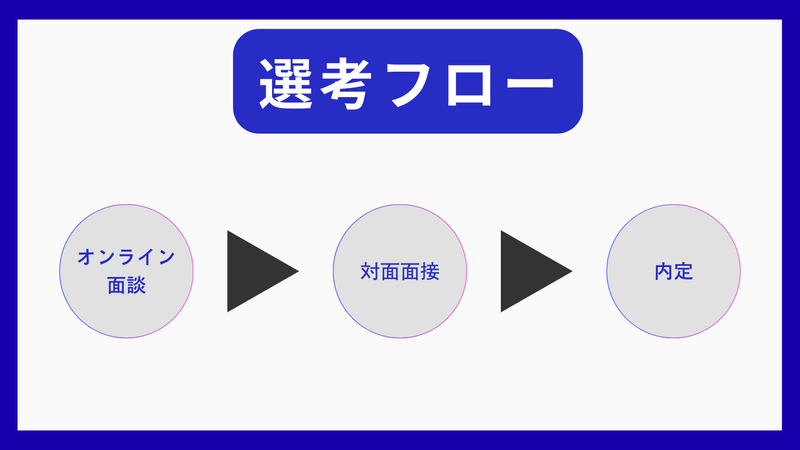 選考プロセス 【選考フロー】 ①カジュアル面談(オンライン) 履歴書などは必要ありません、まずは気軽にオンラインで話しましょう! 会社の説明気を聞いていただき、気になる点をご質問ください! ②対面面接 こんな仕事をしてみたいなどなんでもご相談ください! ③内定