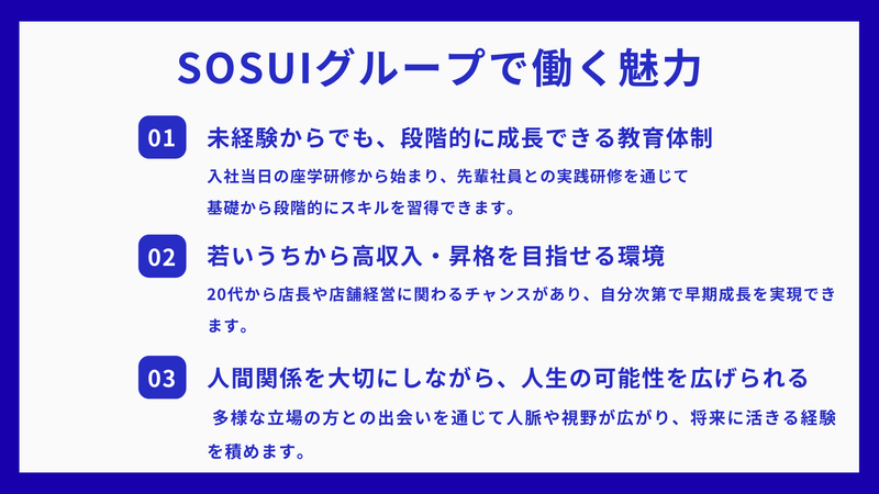 求めている人材 【こんな方を歓迎します】 ✅ 人と関わる仕事が好きな方 ✅ 単純作業ではなく、コミュニケーション力を活かしたい方 ✅ 年功序列ではなく、実力で収入や役職を上げたい方 ✅ 20代・30代のうちに人脈や経験を広げたい方 ✅ 将来的に店長・幹部・経営者を目指したい方 ✅ 自分の可能性を広げたい方 ✅ 人が何をすれば喜んでくれるかを考えられる方