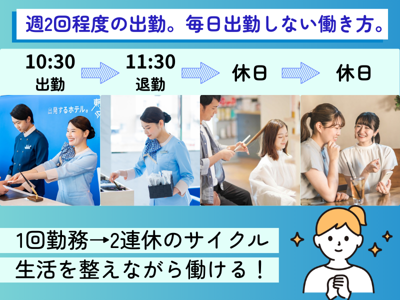 勤務時間詳細 総労働時間:1ヶ月あたり150時間15分 〜 171時間 10:30~翌11:30(実働時間20時間45分) (休憩4時間15分※仮眠含む) ~1日の流れの一例~ 10:30 出勤・制服に着替える 11:00 朝礼・引継ぎ・予約数の確認など 15:00 チェックイン対応・フロント対応 24:00 仮眠・休憩 04:00 ロビー設置のアメニティ補充 06:00 朝食会場のお手伝いなど 08:00 チェックアウト対応・引継ぎ 11:30 退勤 <その他> 月1回フロントミーティングあり ▶10:00~16:00(休憩1時間) ※無料で昼食も提供されます。