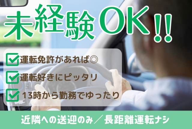 仕事内容 ご利用者さまを安心・安全に送り届けるドライバーのお仕事です! ◎運転が好きな方必見!未経験の方でも安全運転ができればOK◎ ◎13時から勤務開始で午前中はゆったり過ごせます♪ <業務内容> 放課後等デイサービスに通う児童を、 ・学校から拠点(昼) ・拠点からご自宅(夕方) へ、安全に送迎していただきます。 ■使用するのは普通自動車なので、特別な免許は不要です。 ■送迎ルートは【相模原市】 ■近隣への送迎が中心のため、長距離運転もほとんどありません。