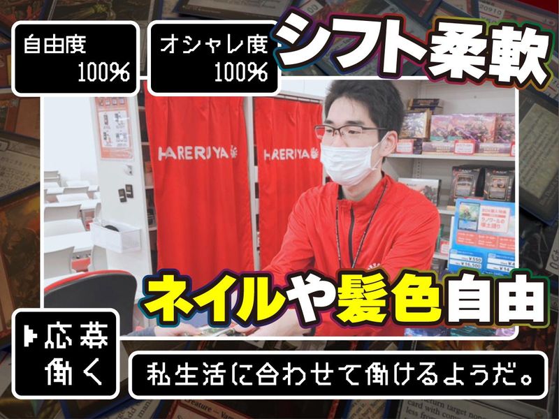 求めている人材 ・未経験歓迎/経験不問 ・第二新卒OK ・学生・フリーター・しゅふ歓迎 ・トレーディングカード経験・知識不問 ・Wワーク・副業ok ・長期勤務歓迎 【こんな方にぜひ!】 *接客や人と関わることが好きな方 *ちょっとレアなお仕事がしたい方 *アルバイトから正社員を目指して 頑張りたい方 *土日祝の勤務が可能な方 【こんな経験も活かせます!】 ・コンビニや飲食店等での「接客・販売」 ・倉庫や製造現場での「軽作業」 ・店舗運営やマネジメントなど「リーダー」