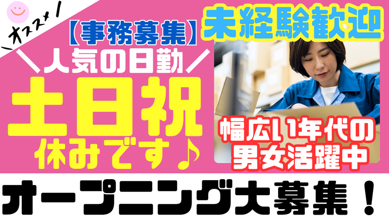 求めている人材 <未経験スタート大歓迎!> ◎経験&性別不問で大歓迎! ◎簡単×シンプル単純作業で安心♪ ◎細かな作業が好きな方大歓迎! ◎20代/30代/40代/50代活躍中! ⋆⸜ こんな方活躍中 ⸝⋆ ★未経験歓迎! ★経験者歓迎!ブランク歓迎! ★出荷作業や検品作業、 仕分け作業、梱包作業などの経験者 ★初めての派遣業界や軽作業の方、 倉庫内作業も大歓迎! ★コツコツモクモク自分のペースで お仕事をしたい方