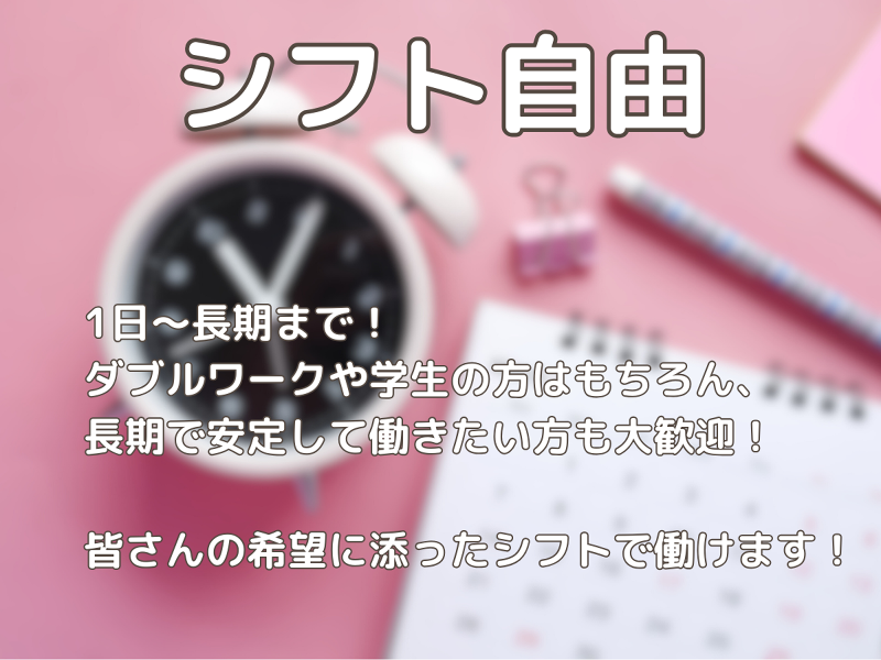 シフト制 勤務時間・曜日: 【主な勤務時間】 ・9:00~18:00 ※近隣のその他の時間 ・8:30~17:30 ・9:00~17:00 ・9:30~18:30 ・13:00~19:00 ・14:00~22:00 ・18:00~22:00 ・22:00~6:00 など多数 ※希望の時間、仕事内容でご案内します 【残業】選択可 【出勤日】自分の希望で週1~5日で選択OK!