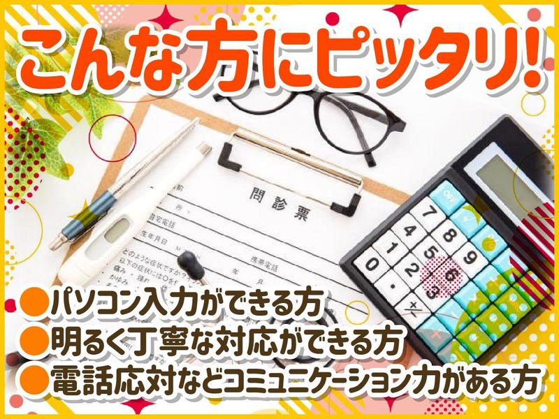 求めている人材 ◎未経験OK! ◎受付事務の経験者優遇! ◎資格不問 ◎ブランクOK ◎扶養内勤務で働きたい方 ◎クリニック勤務経験は問いません。 ◎子育てが落ち着いて久しぶりに働きたい方 ◎子育て中の方もお気軽に! =================== 【必須条件】 ・パソコン入力ができる方(ブラインドタッチできれば尚可) ・丁寧な対応ができる方 ・電話応対などコミュニケーションをとるのが好きな方 =================== 「職場環境づくりは一緒に作っていきたいと考えています。さらに働きやすい環境にするために、皆さんの意見やアイデアも積極的に取り入れたいと考えています。皆さまからのご応募お待ちしております。」 ◆院長より
